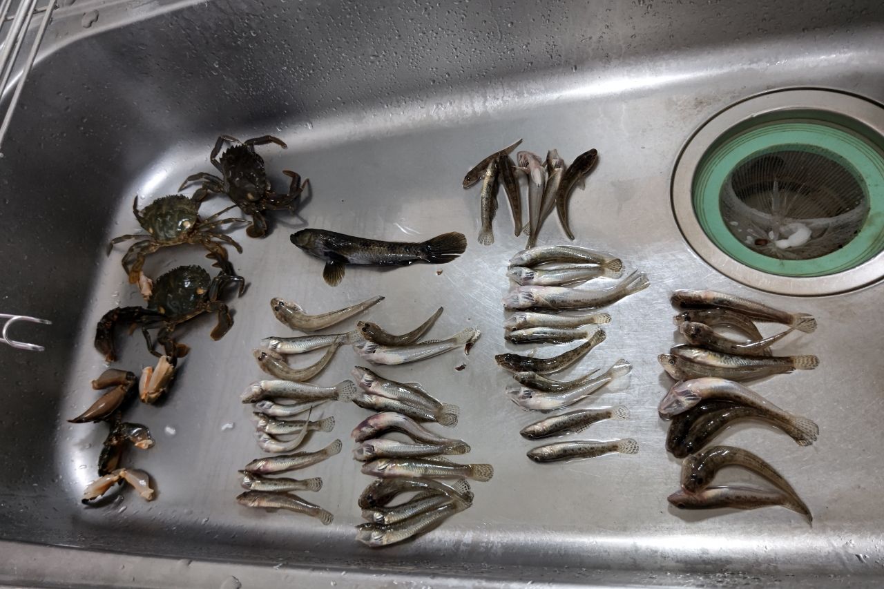 青潮でハゼ掬い。シーバス用タモ網で18cmウロハゼ、ワタリガニ3、マハゼ46匹獲得。ハゼ無限に取り放題でした。