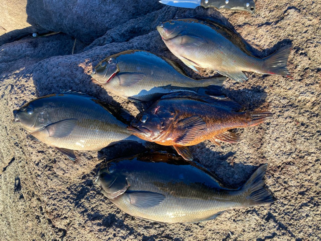 今日は波も穏やかで水温も低く、メジナが全然浮いてきてくれなかったです。沈ませウキを使い竿2本程のタナでようやく釣れる渋い一日でした。あと初日の出をなんとか拝めましたが、朝5時にまさかの渋滞発生していました。。