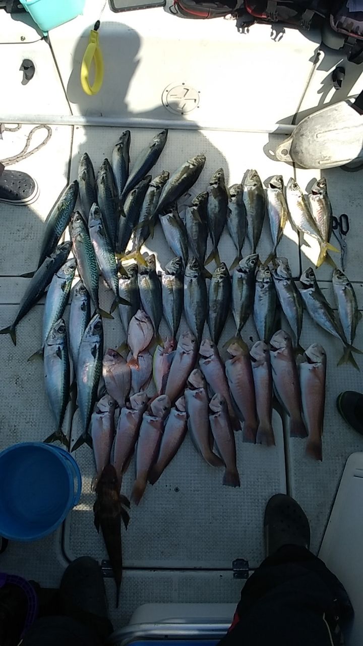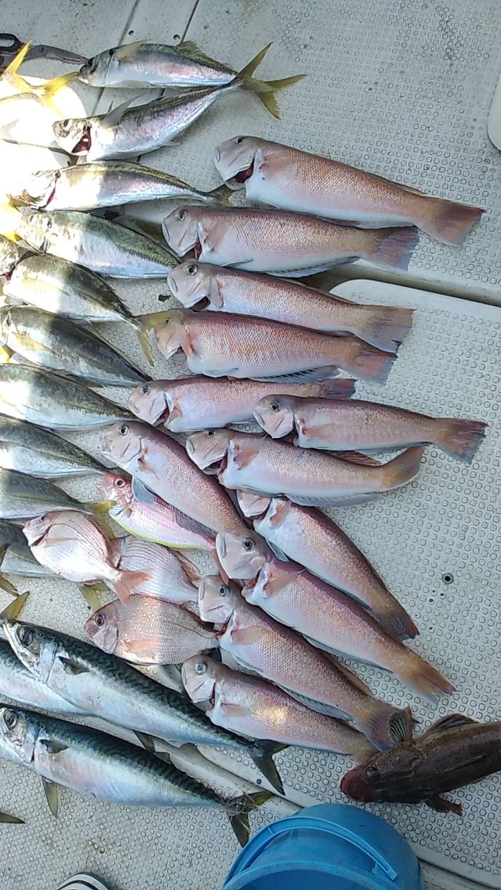 沖の調査に行ってきました😁3人の釣果です。朝から食いが立っていて終始楽しめました。アジとサバは反応あればほぼ入れ食いですね~。アマダイのクンクンバイト、癒されるぅ~😳
