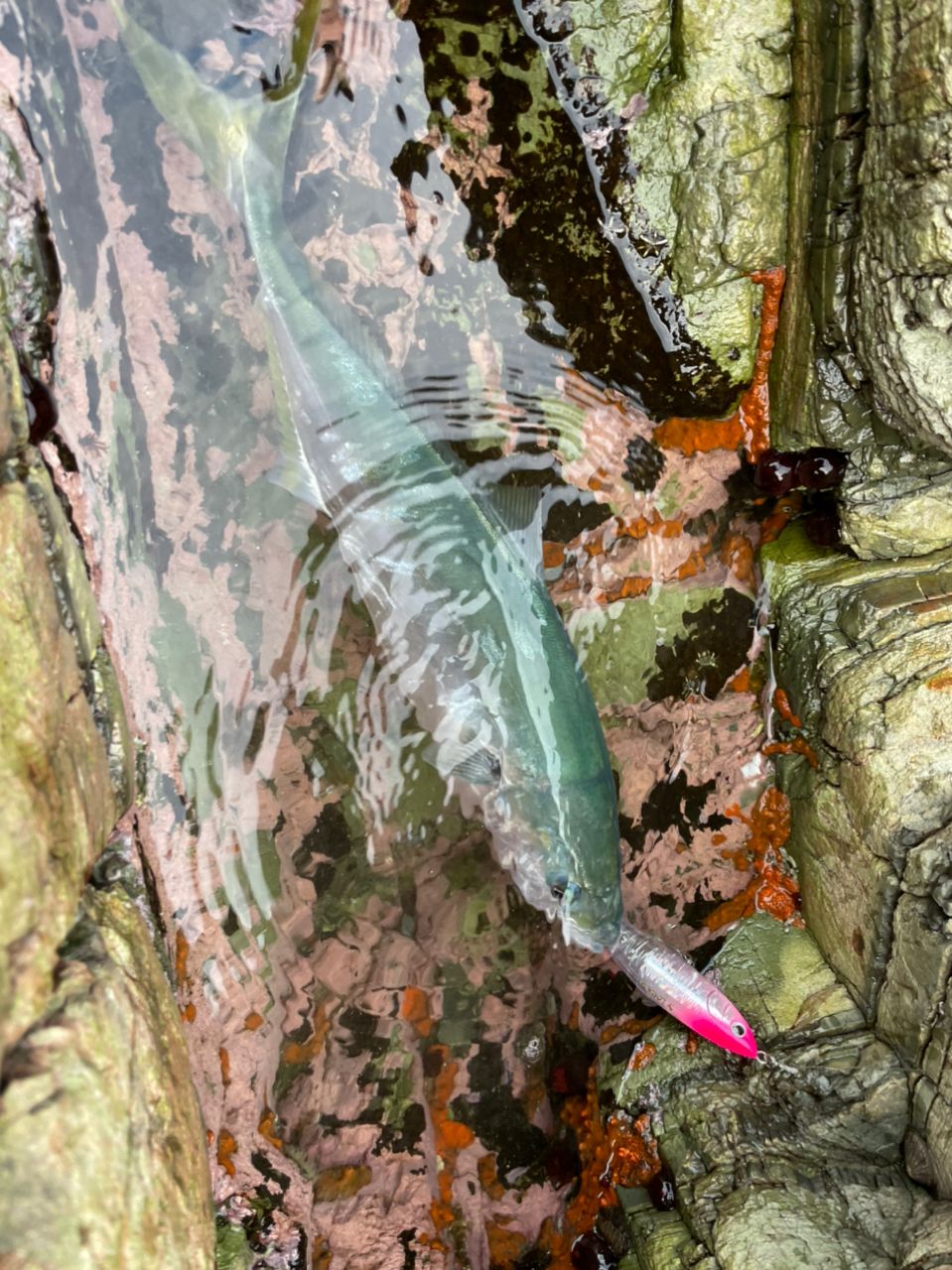 トップというより、ダイブさせてからただ巻きでヌルッと少し潜らせ水の抵抗を感じるように緩く巻いてるとグイッと重たくなる当たりで、軽く合わせると生命感がありファイト開始!