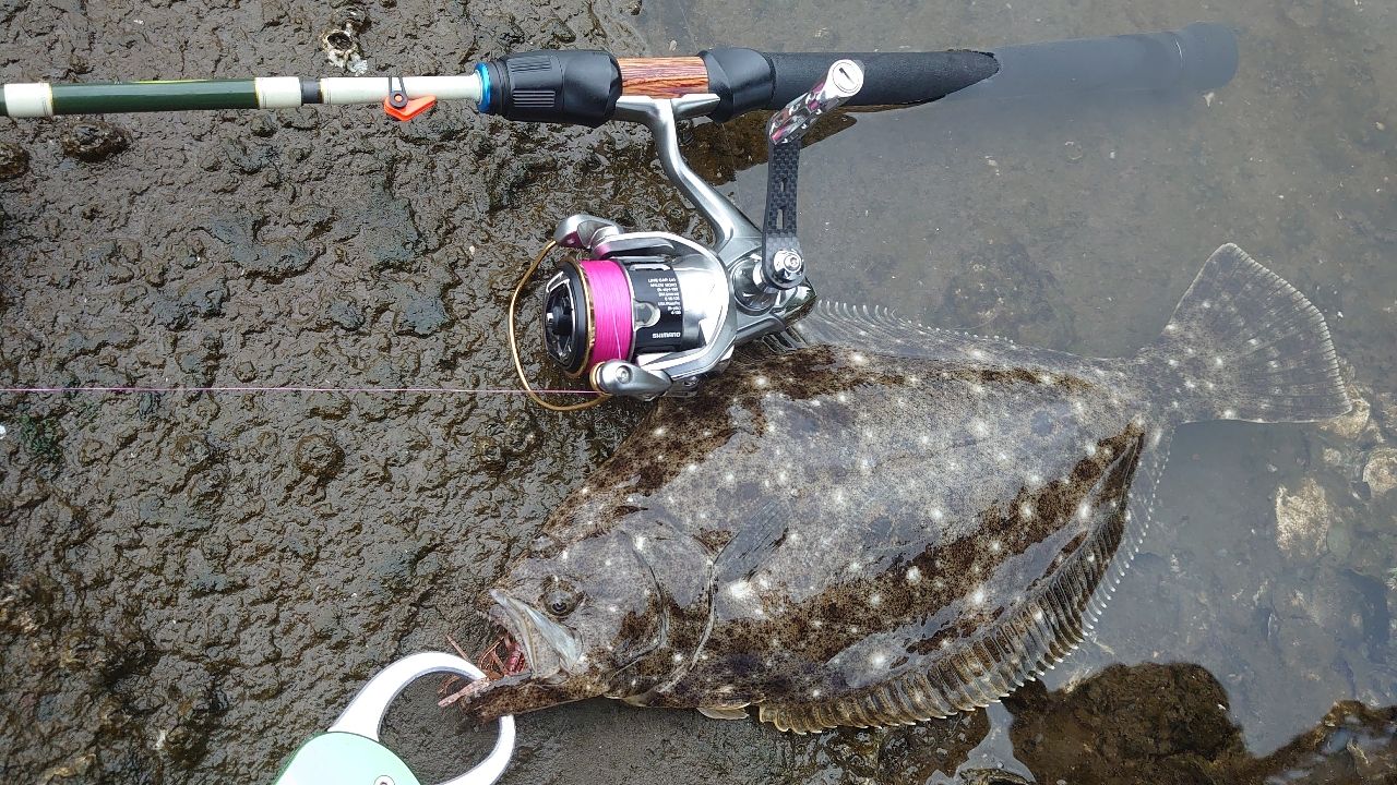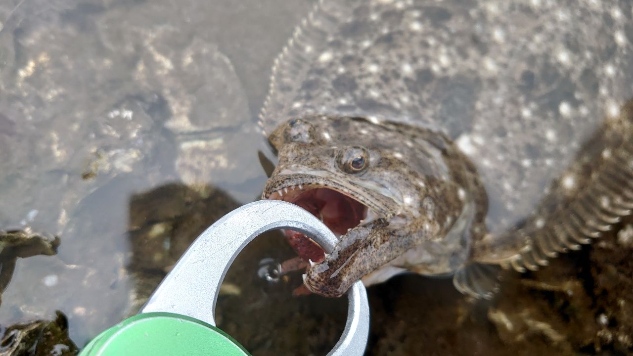 橋脚付近にキャストして、フリーフォールで着底を待っていると糸がスルル~と。即座に合わせるとチヌとは違う引き。正体は嬉しいゲストのヒラメ。リトルスパイダーのフォールめっちゃ良い感じです。
