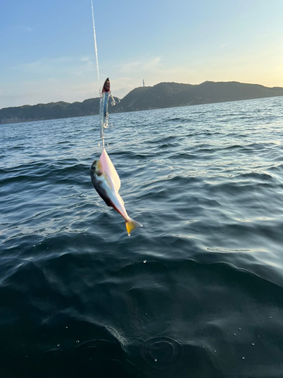 ダツ→フグと来て、シーバスバラしからのコノシロ祭りの下探ったらワカシが釣れました。昨日のより小さい子でしたがよく引きました。