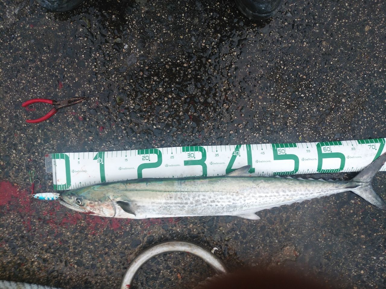 先日釣れた場所で時合いに🎯が無くて直ぐ近くに場所移動、先人がサワラを釣ってたので振ったらやがて凄い引きで釣り上げた。メジャーあてがったら75cm自己更新( ´∀`)嬉しい‼️😊