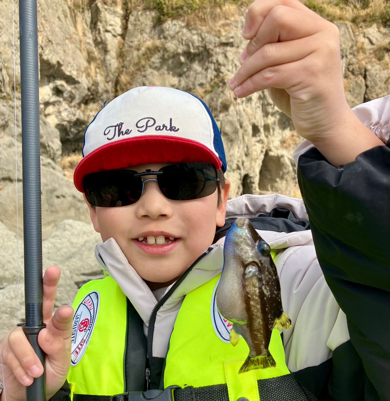 息子パパチームもメジナは釣れませんでしたが、磯を移動した後のポイントでは、お隣の名人がノリでメジナを釣り上げるところを見ることができ、いい経験となりました。