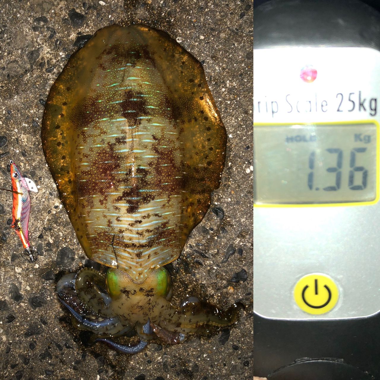 エギング〜微風だから東風の場所行くもコロッケサイズばっかだ〜🥹昨日の場所に移動〜薄いベイトの1箇所だけ砂地が見えてたから延長線上にキャストすぐにヒット!久しぶり 2kgと思ったら、足らず😮💨その後すぐ1.3kg来てベイト散るとアタリ無しで終了☑️新品のエギが😱