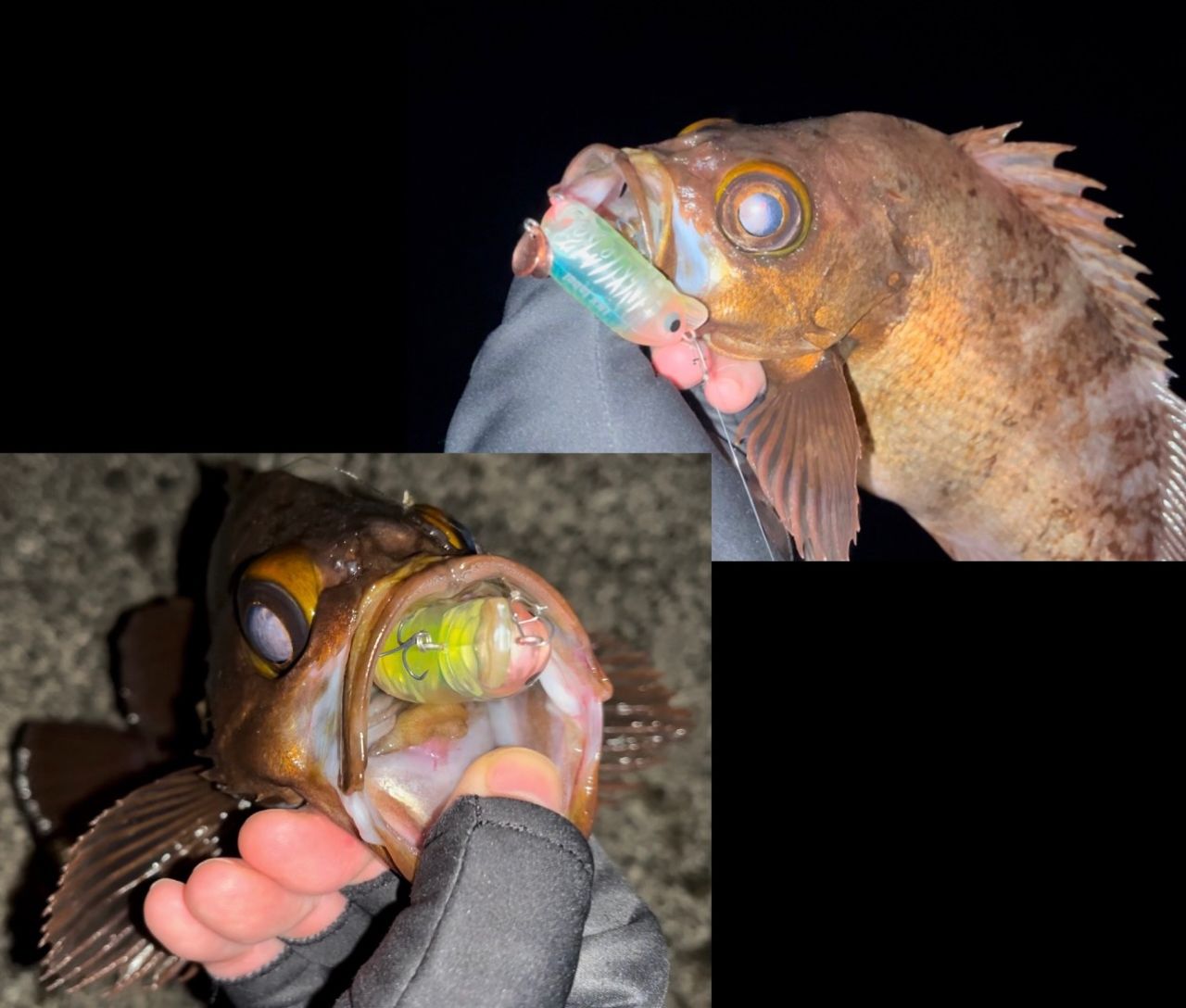 日没直後にリップをカットしたJ.BOYで尺メバルを3匹釣ったところでピタリと当たりが無くなり、スワールテールXGを入れるとデカいのに根に持って行かれラインブレイク🥶