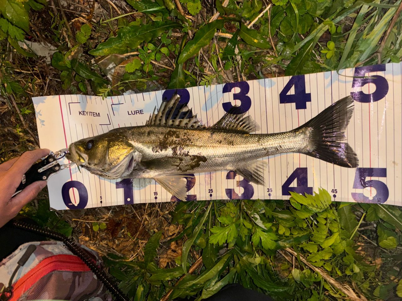 明暗ギリギリをデッドスローでヨタヨタ巻いてたら後ろにシーバスがついてきたのが見えたので足元でトゥイッチしたらパクりと喰ってくれました。