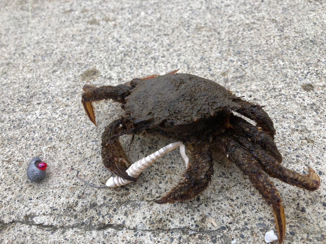 朝まで釣りしたらカニがいたのでぼくが釣ってパパがたもですくってくれました🦀🥳🤩
