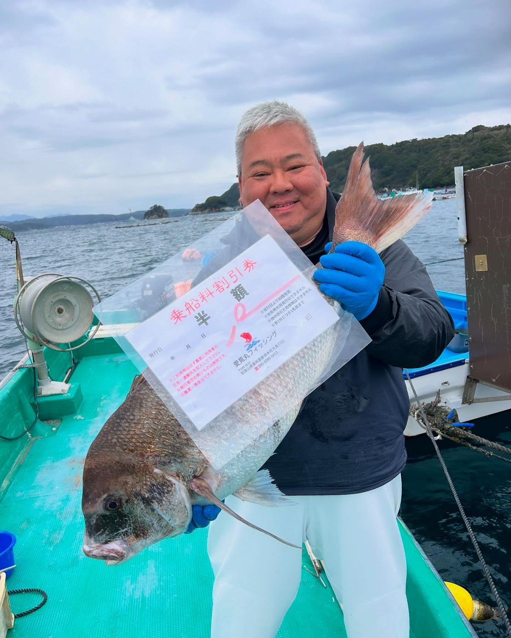 その後45cmのシマアジが2匹釣れ、10時過ぎ風も強まってきた頃に大きな当たりが!! 待望の乗っ込みマダイ しかも大鯛80cm 。当船の乗っ込み真鯛チャレンジの第1号80cm🆙で乗船料半額券🎫ゲットしていただきました。