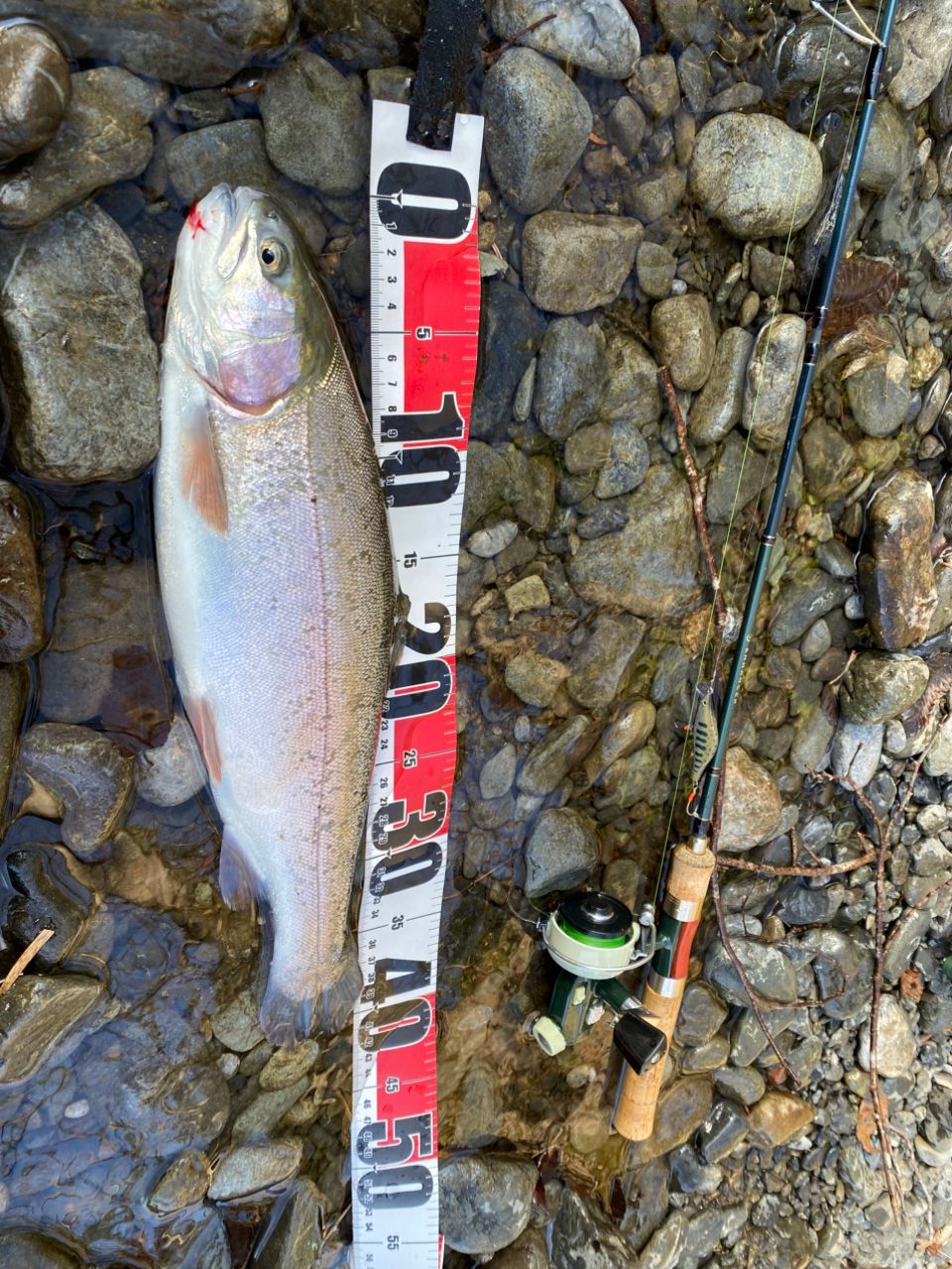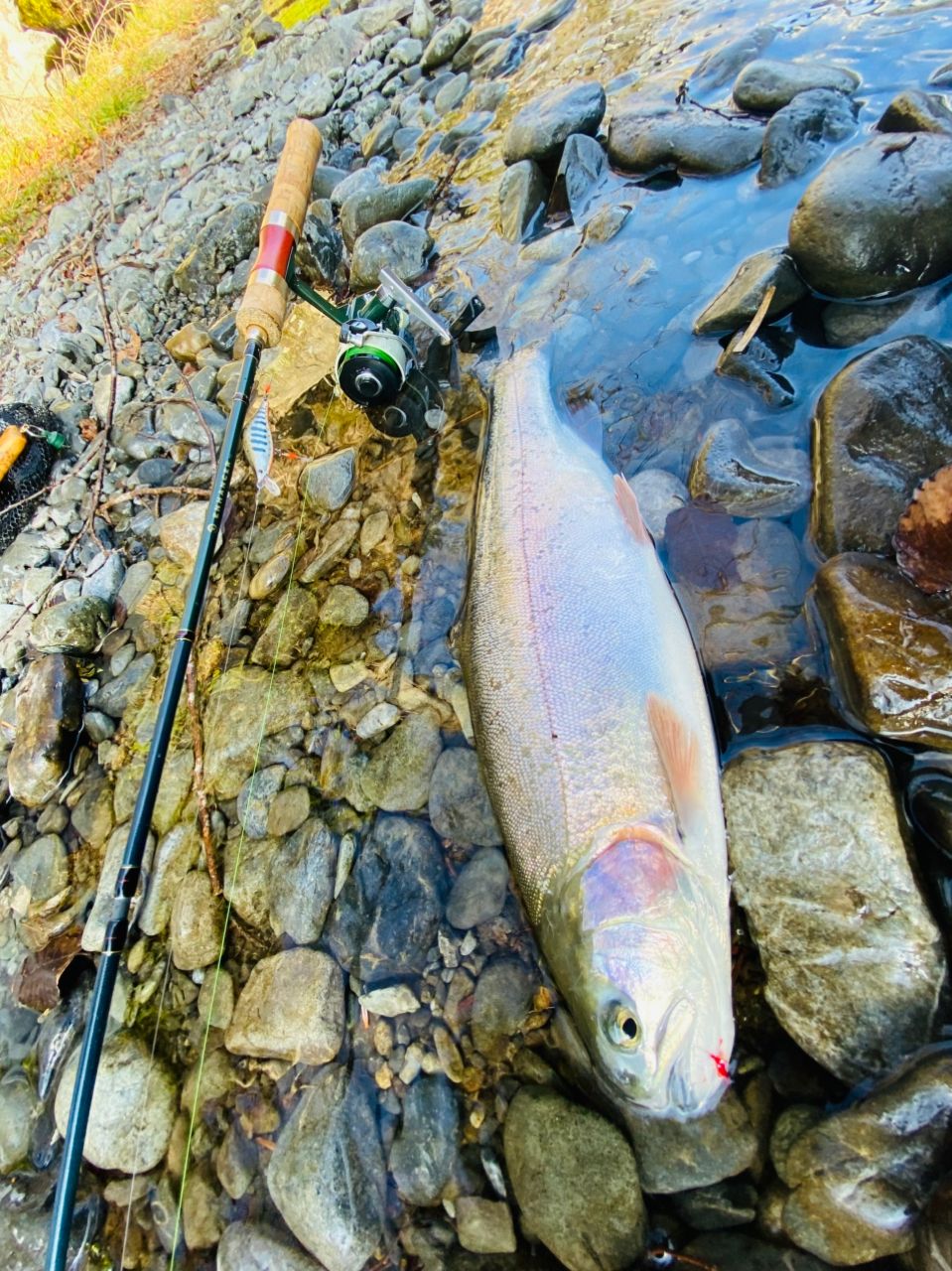 太い流れの流心でレインボーのバイト。ジャンプするしファイトも結構引いて楽しかったです。