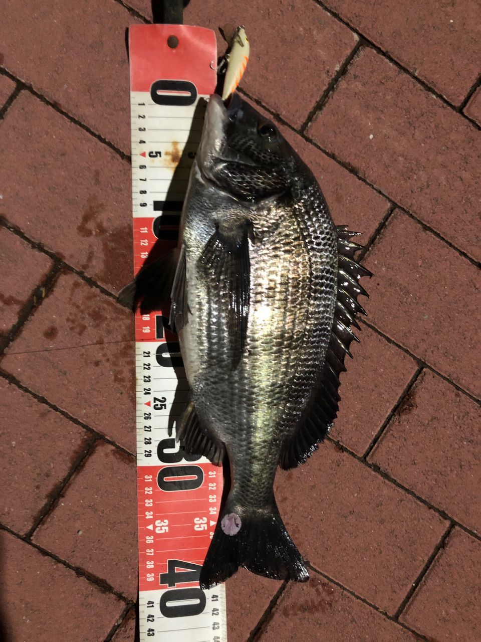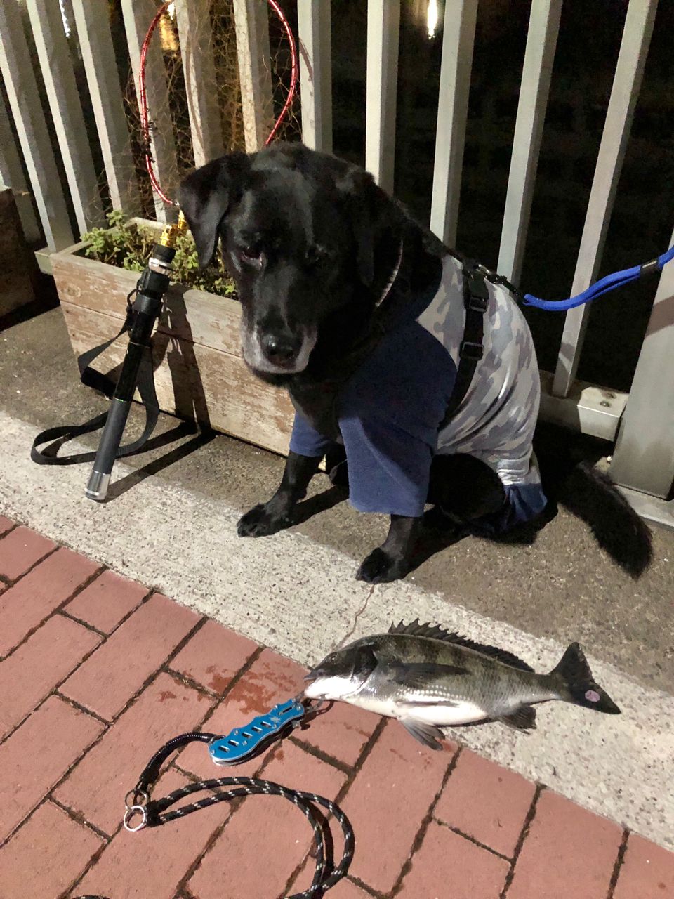 犬の散歩がてら釣りがてら。近所の運河へ愛犬とランガン散歩♪ゆっくりリトリーブすると突然ズンズン!?っと強い引き!!40センチのチヌ(黒鯛)が釣れました!久々に運河での釣果。