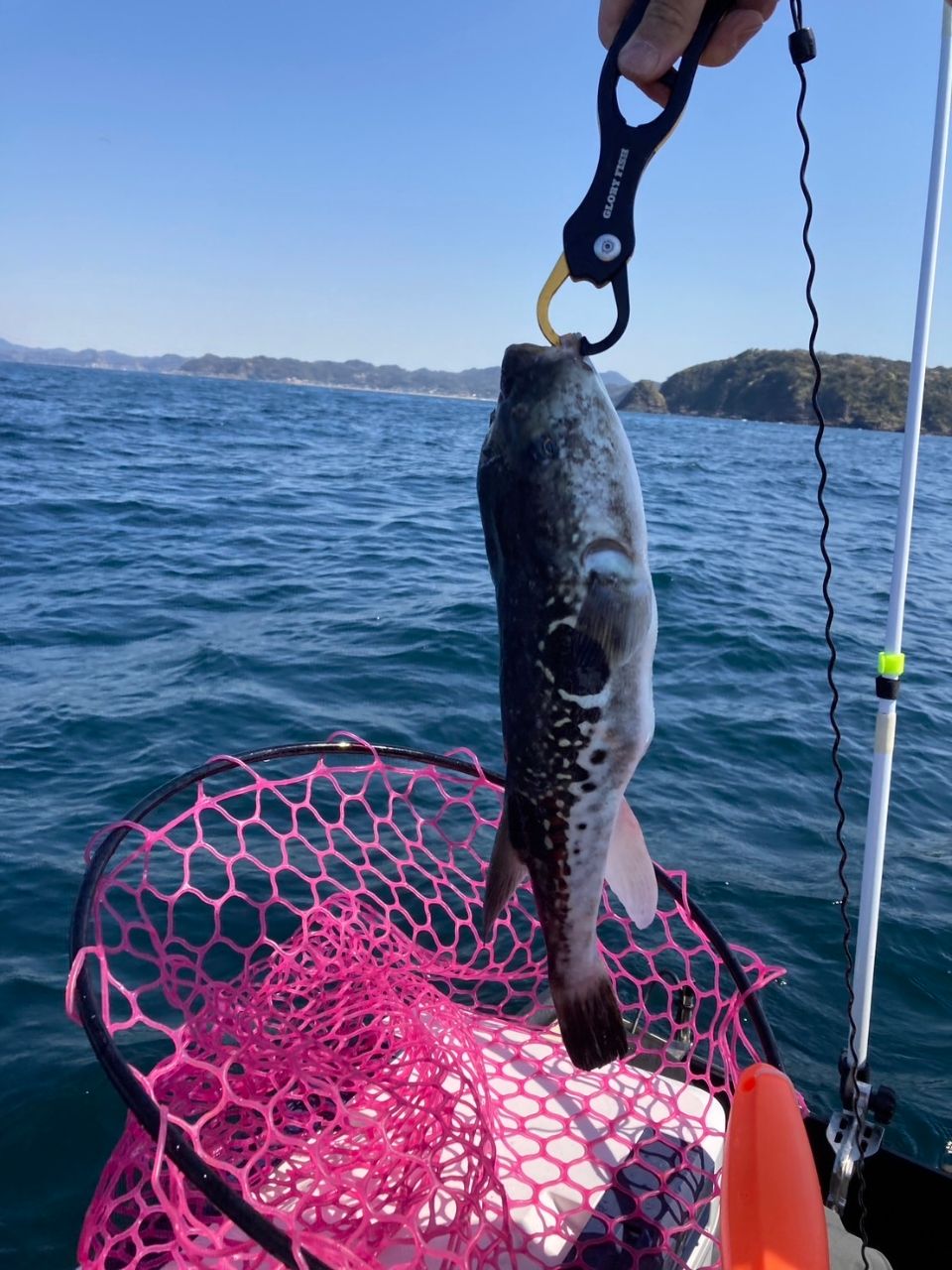 湾内で全然反応がなく、潮が比較的緩かったのもあって沖のトラフグ遊漁船近くまで行き釣り上げました。釣ったところで風が強くなり始めたのですぐに戻りましたが楽しかったようです!残念ながら捌いてくれるところがないのでリリース。