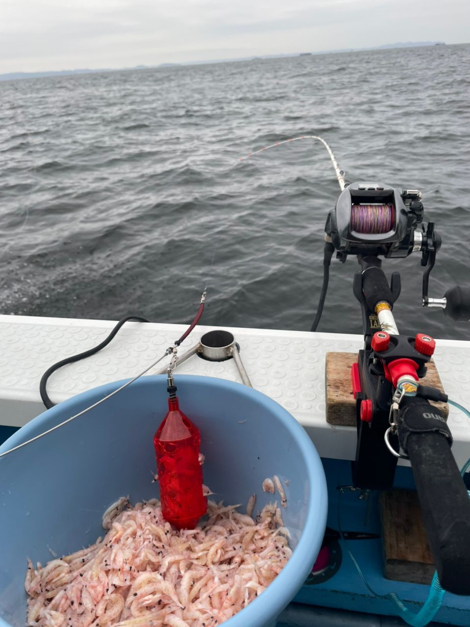 天気は朝から雨、昼前から爆風になる予報のため、朝イチがチャンスタイムです。0640、久里浜沖の航路で釣り開始。開始早々周りでマダイが上がり、期待感が高まります。