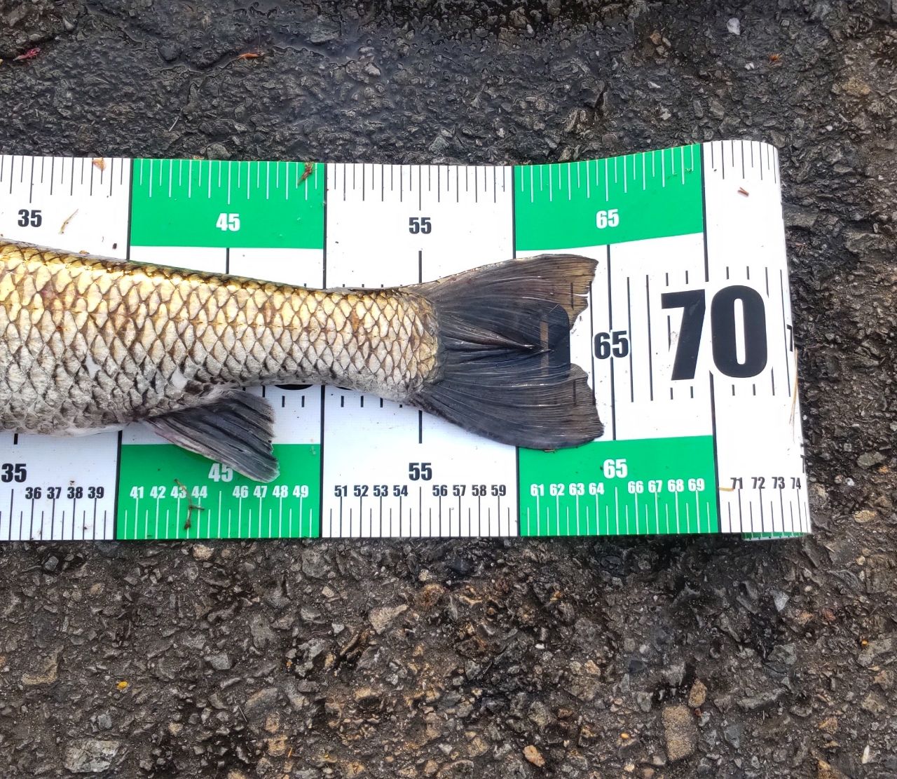 今日の最初のヒットはフナちゃん😁鯉のぼりにヒット👍続いて同じ竿で強い当たり、鯉スパイスのダンゴです✨コイのような当たりで色も黒ぐろとしてて白いお腹が見えるまではコイだと思っていましたがニゴイちゃんでした😆また自己記録を更新する64cm✨このまま1センチずつ記録が伸びて行けば夏ぐらいには70センチ越えそうですね🤣