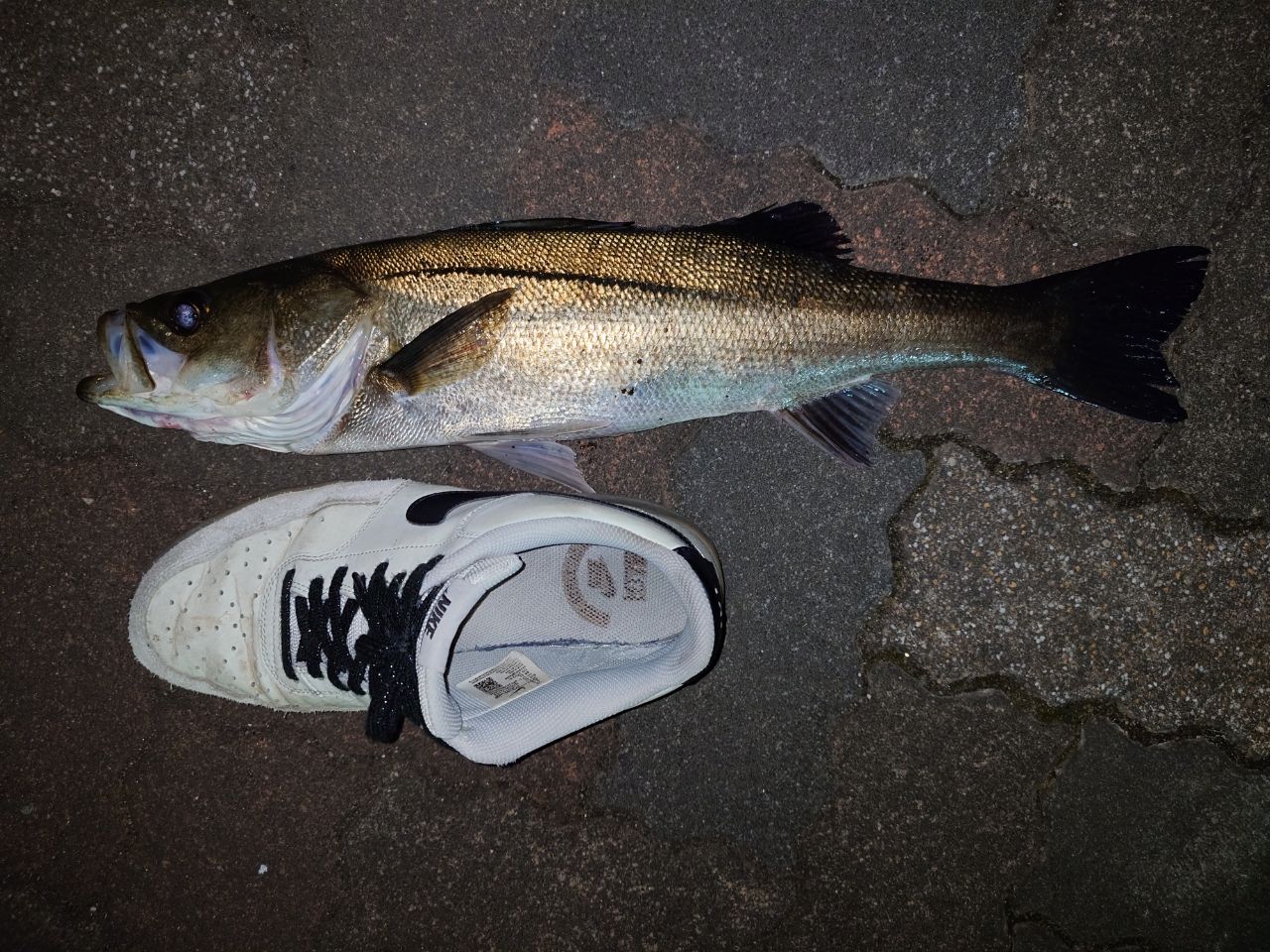 潮回りのせいか強風のせいか土曜の夜なのにあんまり釣り人はいない印象。最初の2匹は40cm前後でしたが最後に粘って60UPくらいをキャッチ。