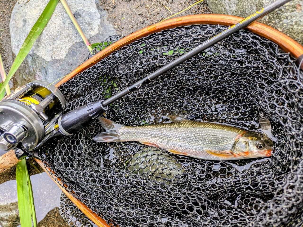 良いサイズのウグイ達が遊んでくれました✨️!Ambassadorに、軽量スプールでどれだけ軽い物まで投げれるか試してみました、Noaスプーンの1.4gが限界でした🎣