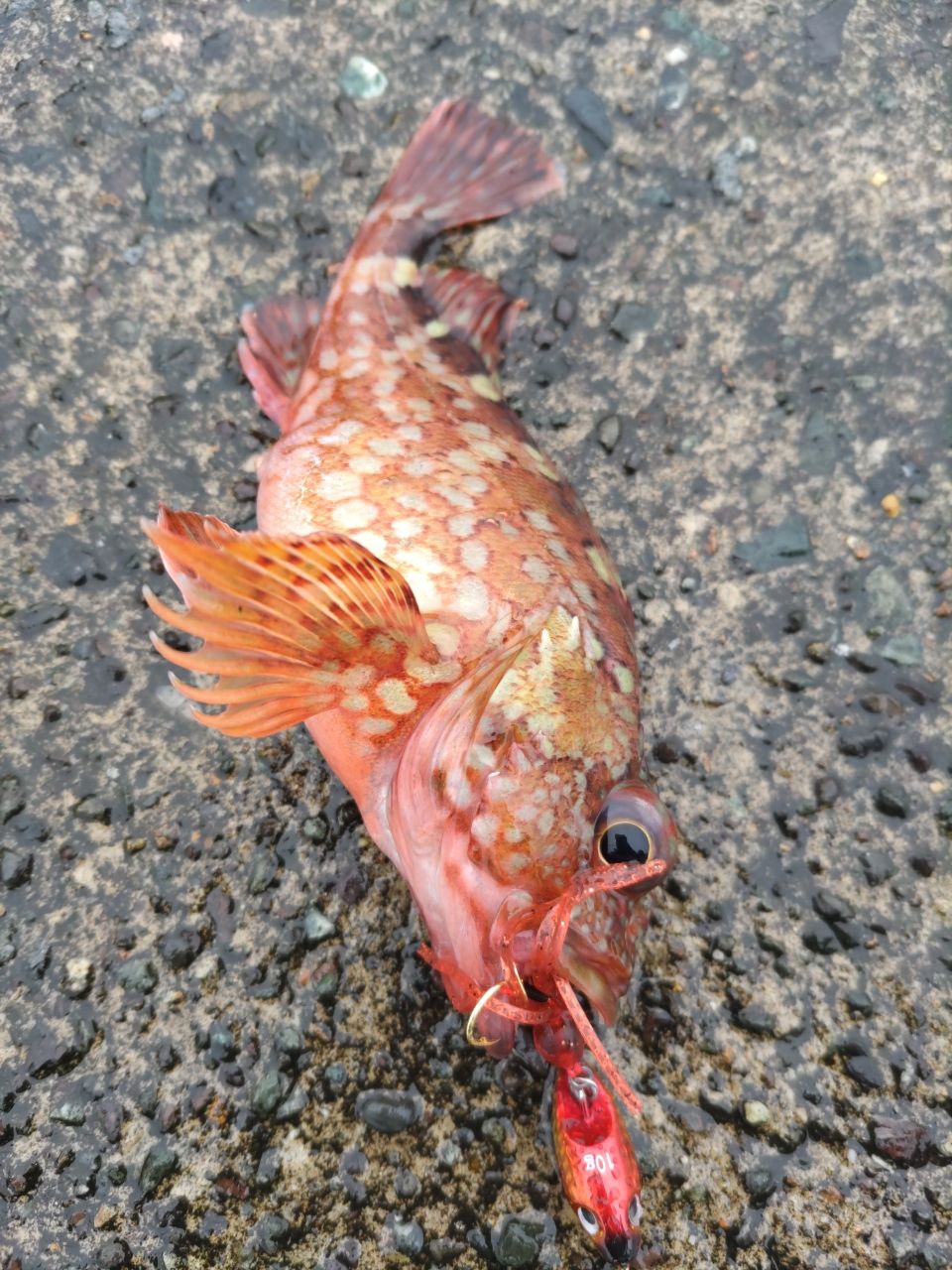ライトショアジギングをしていた釣り友は30cmくらいのミノカサゴ釣り上げててびっくりしました😅