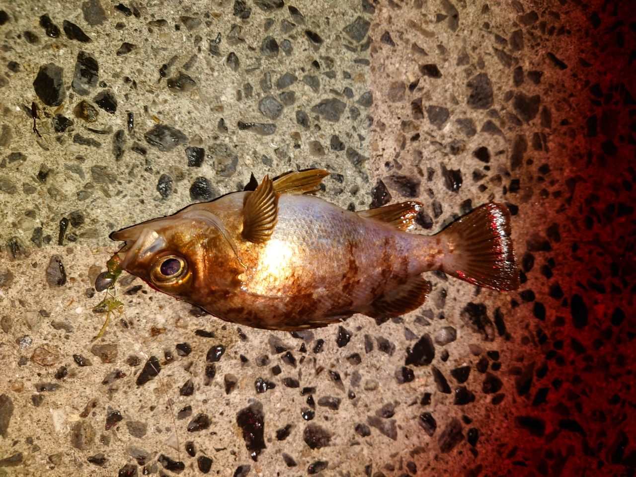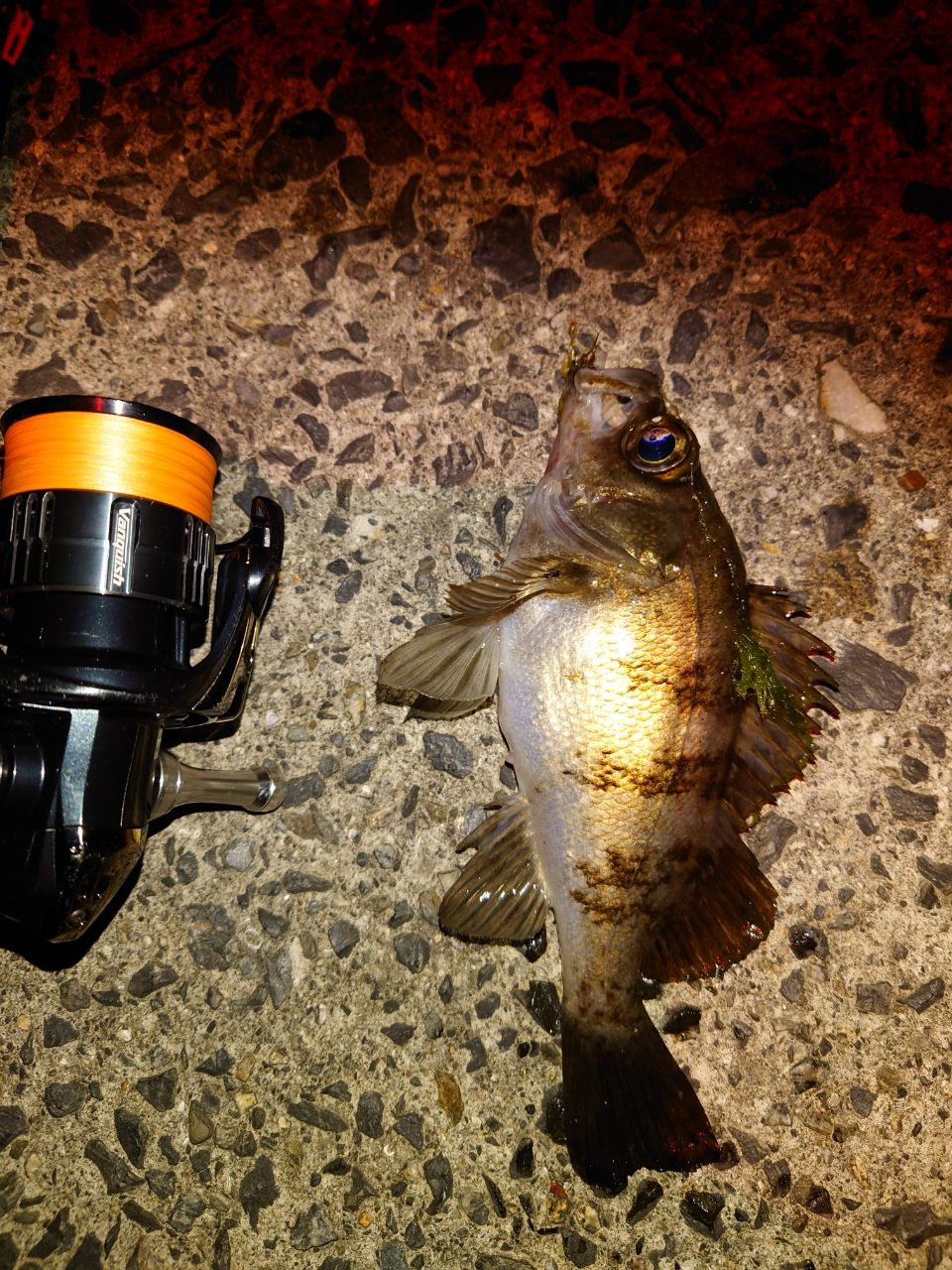 最後のポイントは道路からの照明が少し効いた場所、着水後カウント10からのスローリトリーブで初ヒット。アカメバルがメインでブルーがまざり面白い釣りができました。