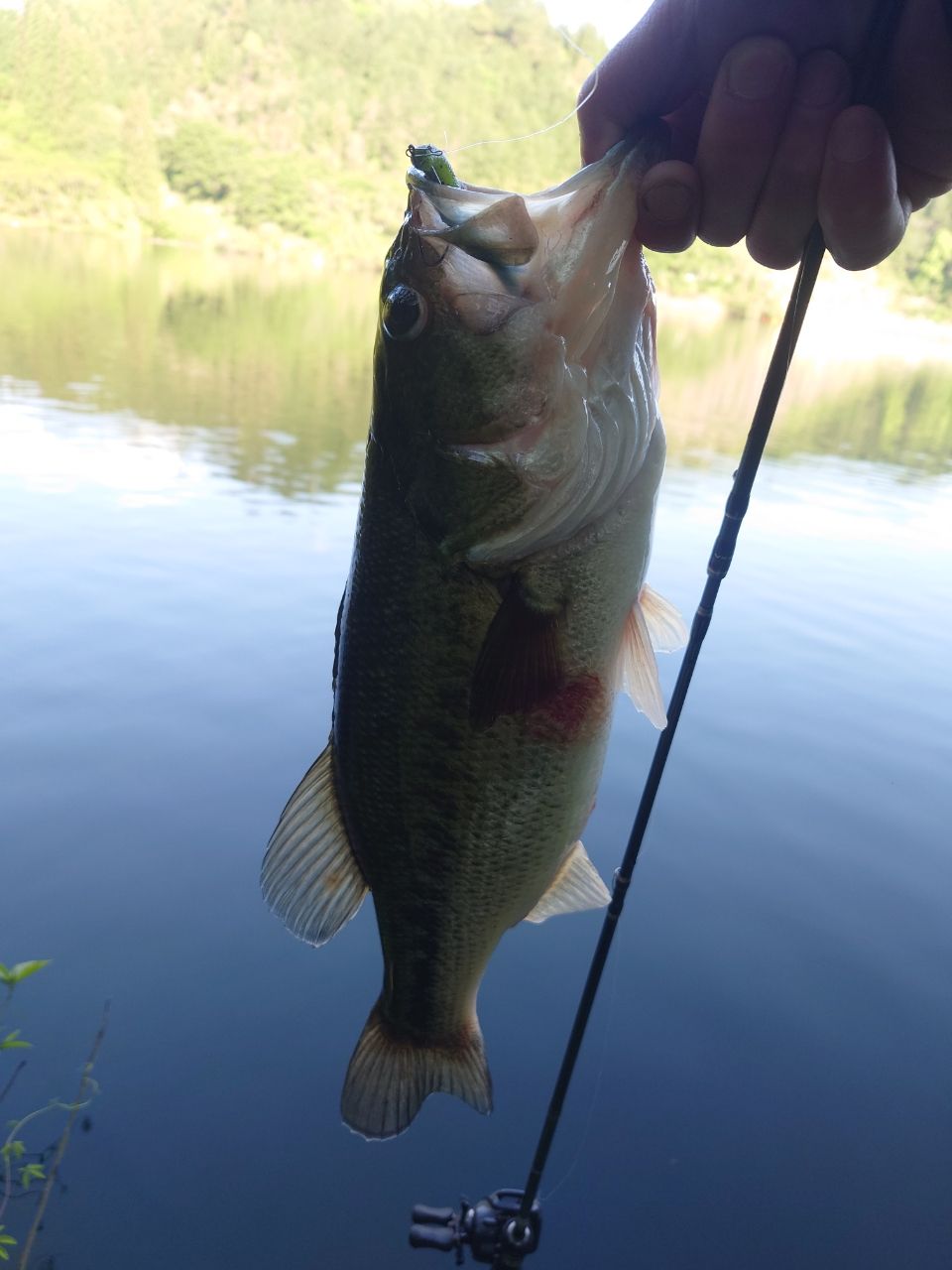 こうなったら…と思い、バッグに入ってたボウズ逃れ用の3インチヤマセンコーのノーシンカーをボトムまで沈めてゆっくりズル引きしてたら、コンッというアタリの後にラインがスーッと動いたので、食ったのを確認してフッキング。あまり引きませんでしたが、ロッドが柔らかいのでそれなりに楽しめました。
