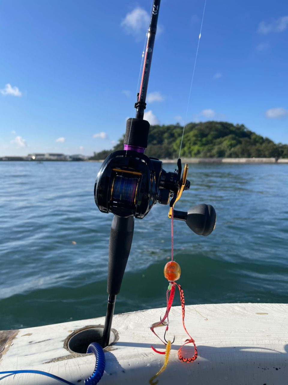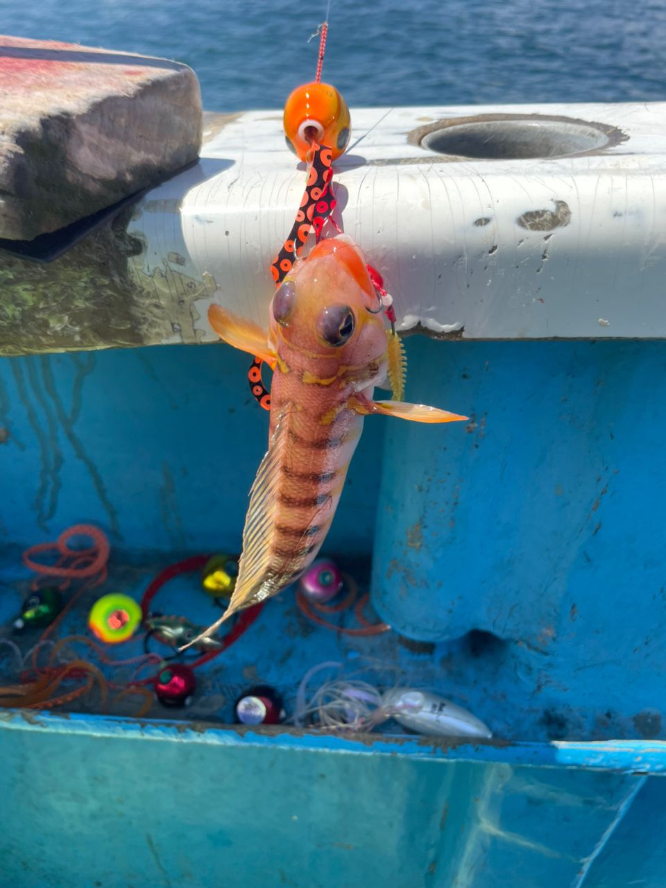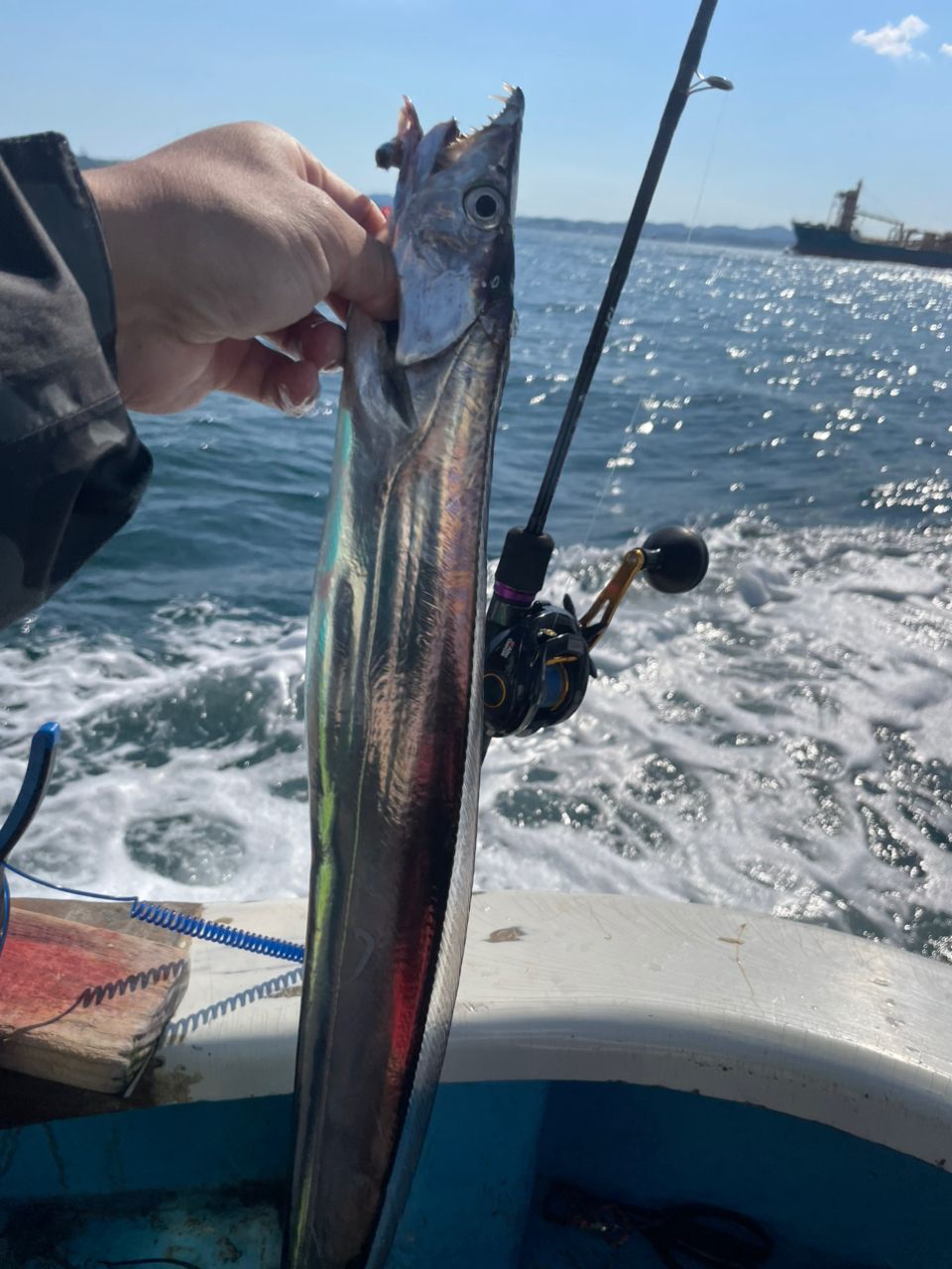 最初にヒットしたのは、巻き上げ回収してるときに、デカタチがヒットしましたが、船に上げるときに針が切れて落ちちゃいました。タイっぽいあたりは一回のみ、合わせたら乗らなかったやつ。