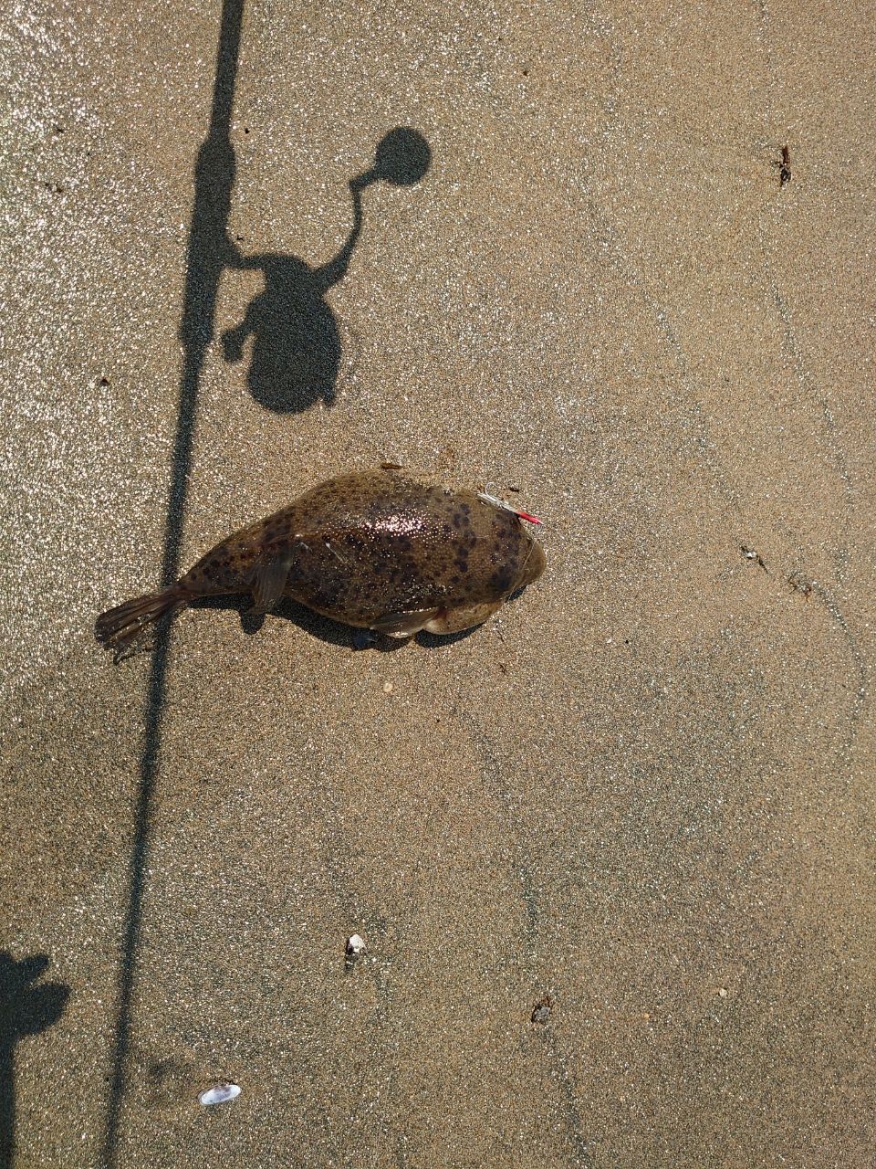 その後ぶらっと歩いて良さげな所を投げてたら、デカいフグが擦れで来ました。