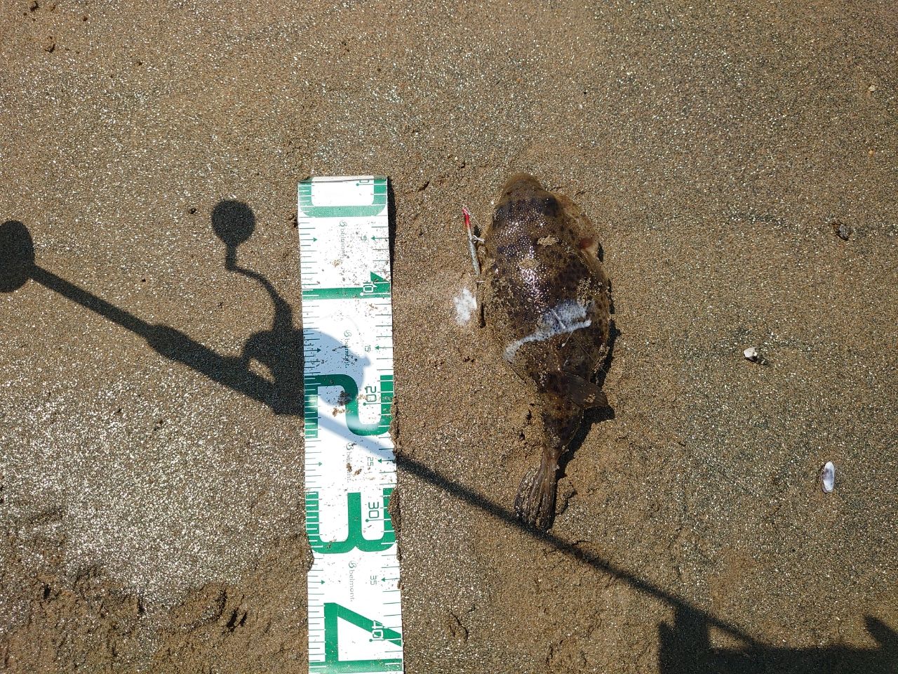 到着した時にはかなり潮が引いていて、とりあえずシンペンをゆっくり巻いてたらエイがルアーに食ってくるという珍事。