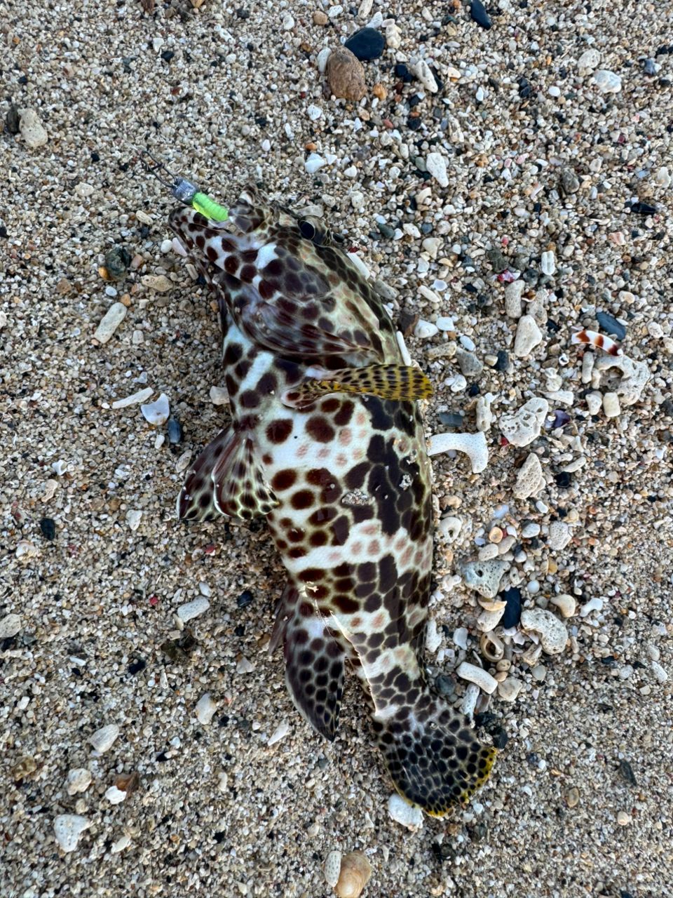 回遊魚の反応がないので底をワームでチョンチョンしたら連続で来ました。その後、たぶんムラサメモンガラにワーム齧られて終了。