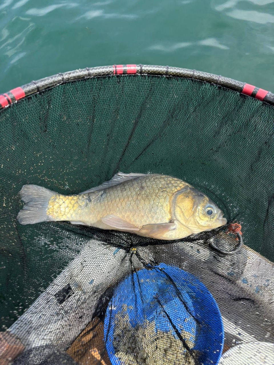 また水位が低いのでアシ際にエサを打つことができないので本湖に移動し21尺ラインを探りましたが、約35cm程のヘラ2枚とマブナが2匹でした。