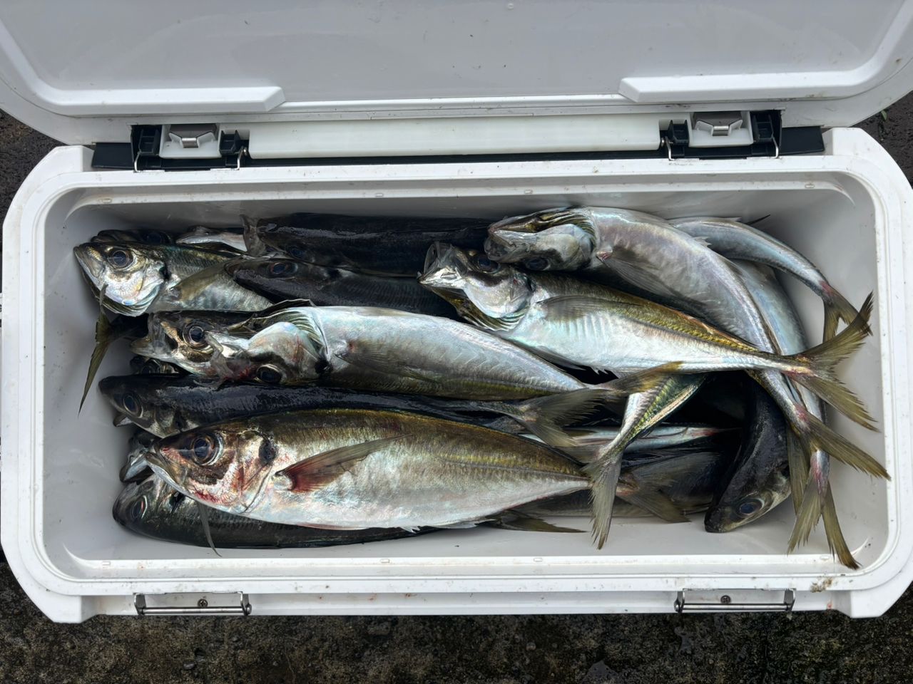 念願のクーラーが満タンになったので、終了❗️アジを入れようとすると前のアジが飛び出して来る始末笑