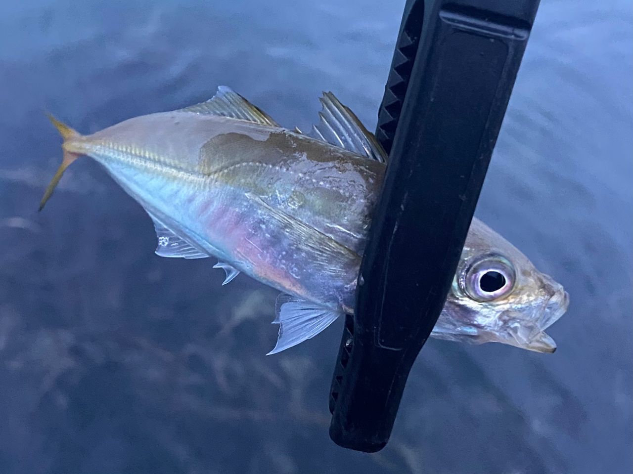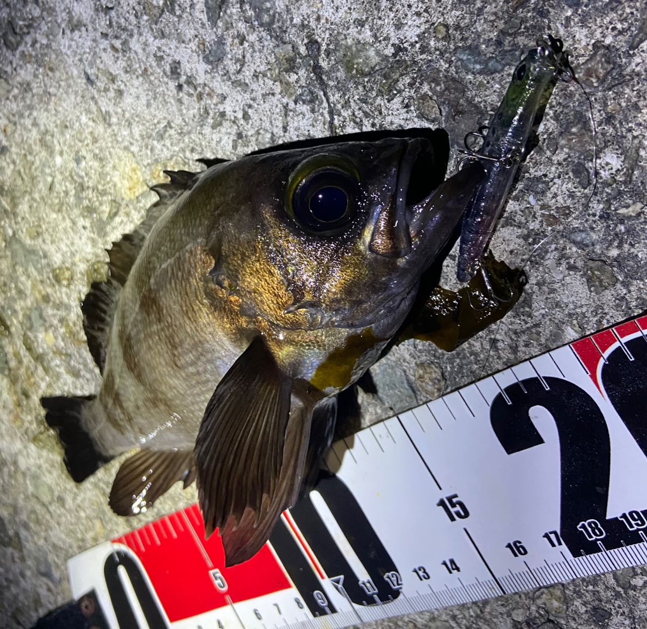 日没後はプラグに持ち替えてメバル狙い、友人にも私の狙い方を参考にして貰う。デカいの掛けてやってもた〜ってって何?50cm位の魚体上げられへんやん笑ボラってプラグにくるん?って笑いながら何とかフィッシュグリップランディング、一旦成功も暴れられて外れて海にお帰りになりました。