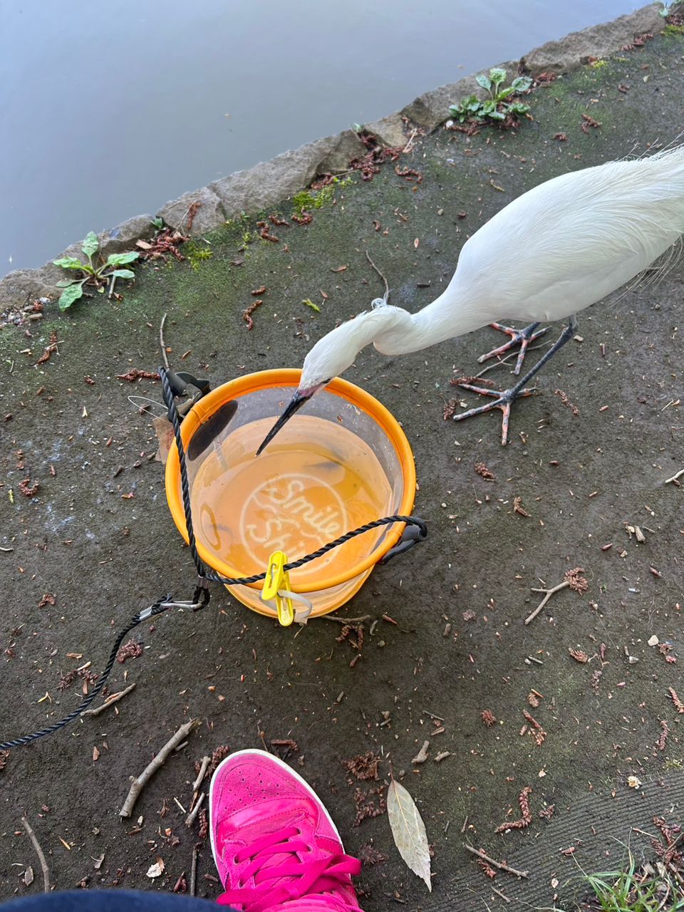 池に住んでるシロサギ『シロちゃん』に釣ったそばから食べられる。