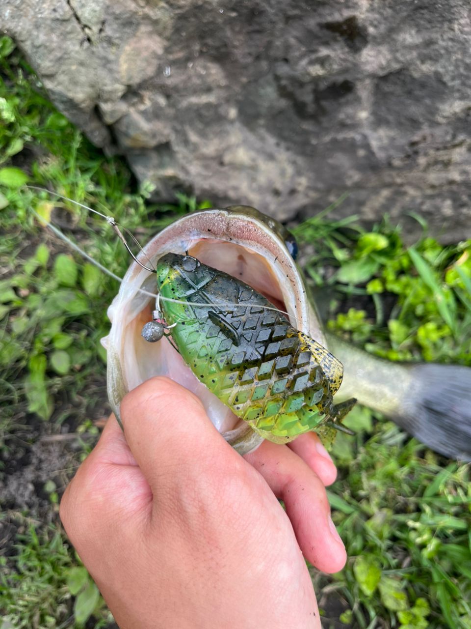 ハスの下に魚影があり、"フナかなー?ワンチャンバス"と思い、少し奥に投げて表層を引いてきたら、まさかの‼️バスが三匹同時に食ってきました笑笑