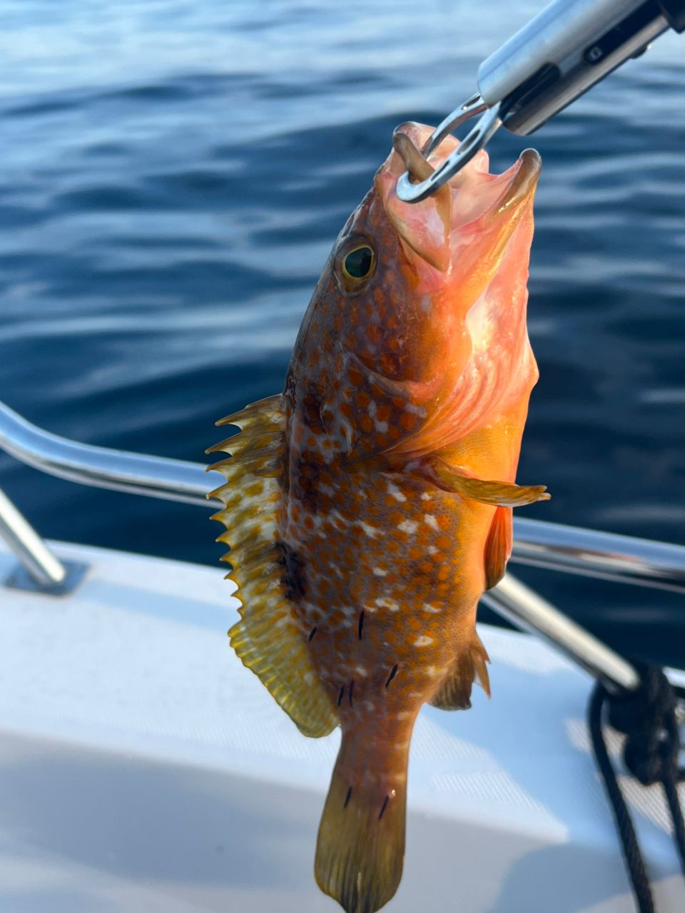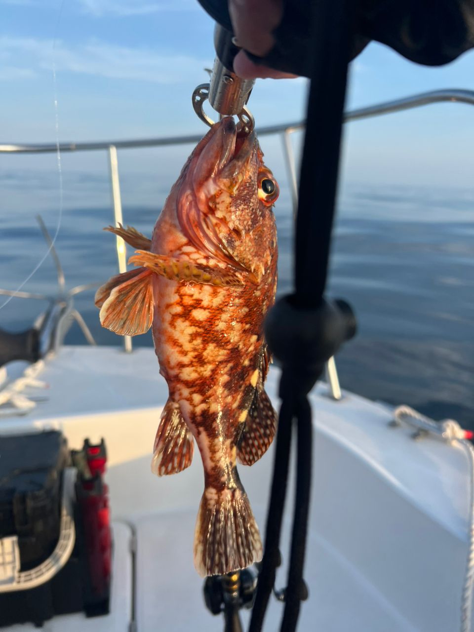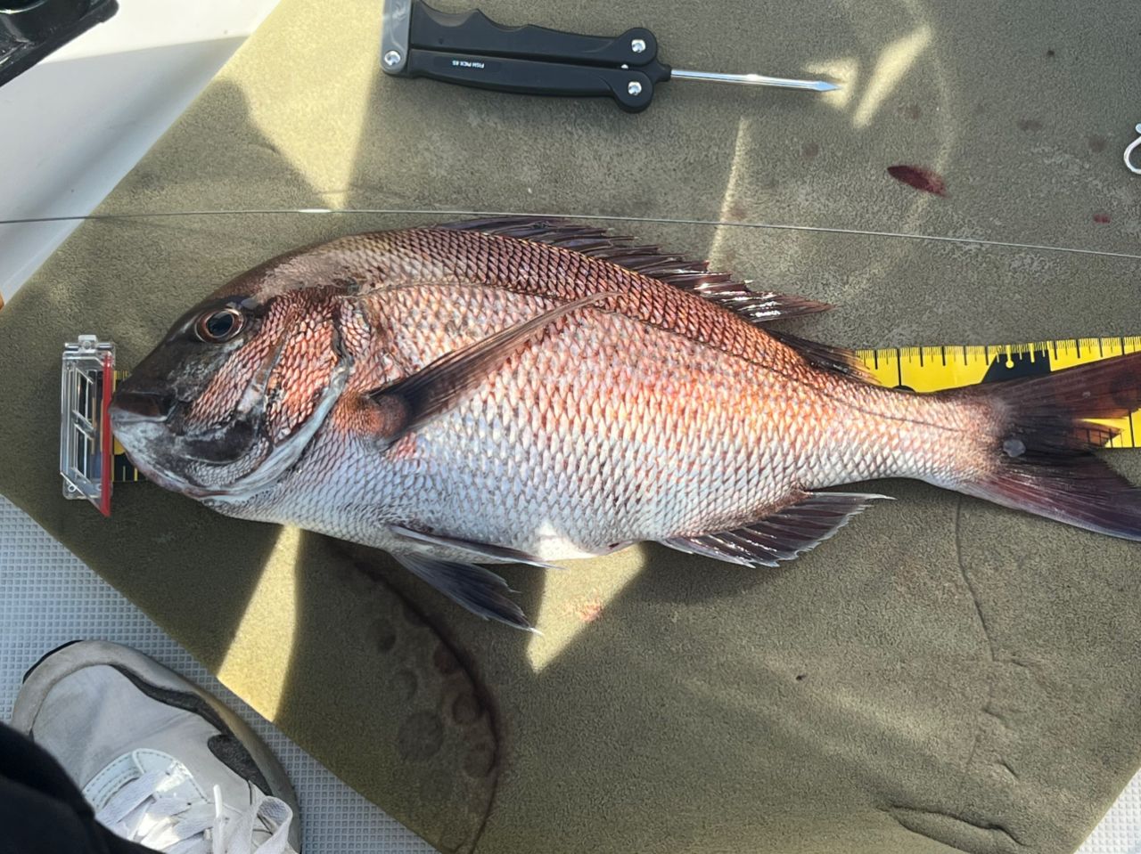 着底後、すぐに引いてのあたりでは、アコウ、ガシラ、アオハタなどが多いようで、この日、唯一の真鯛は、底から10mくらいただ巻きできました。