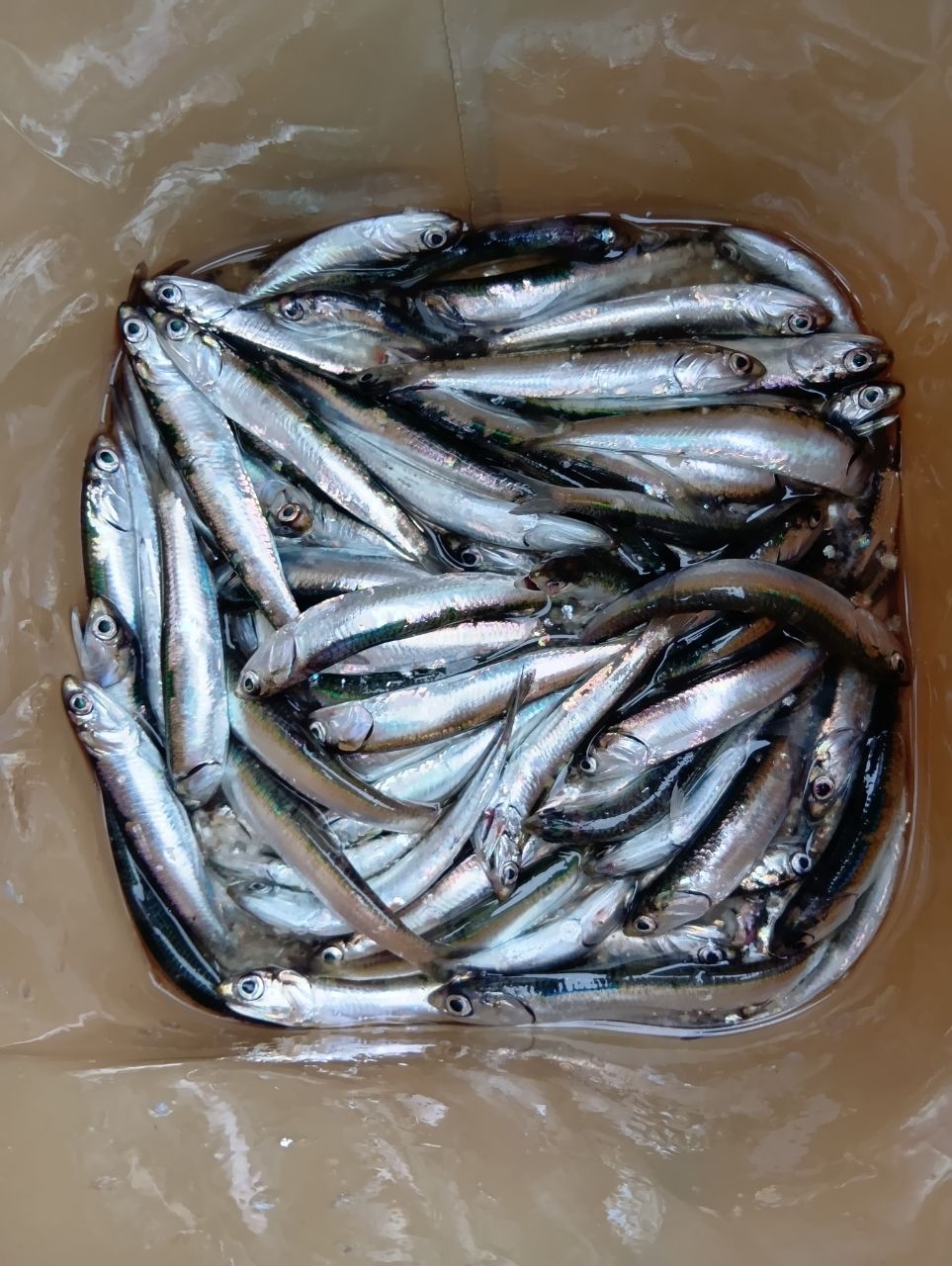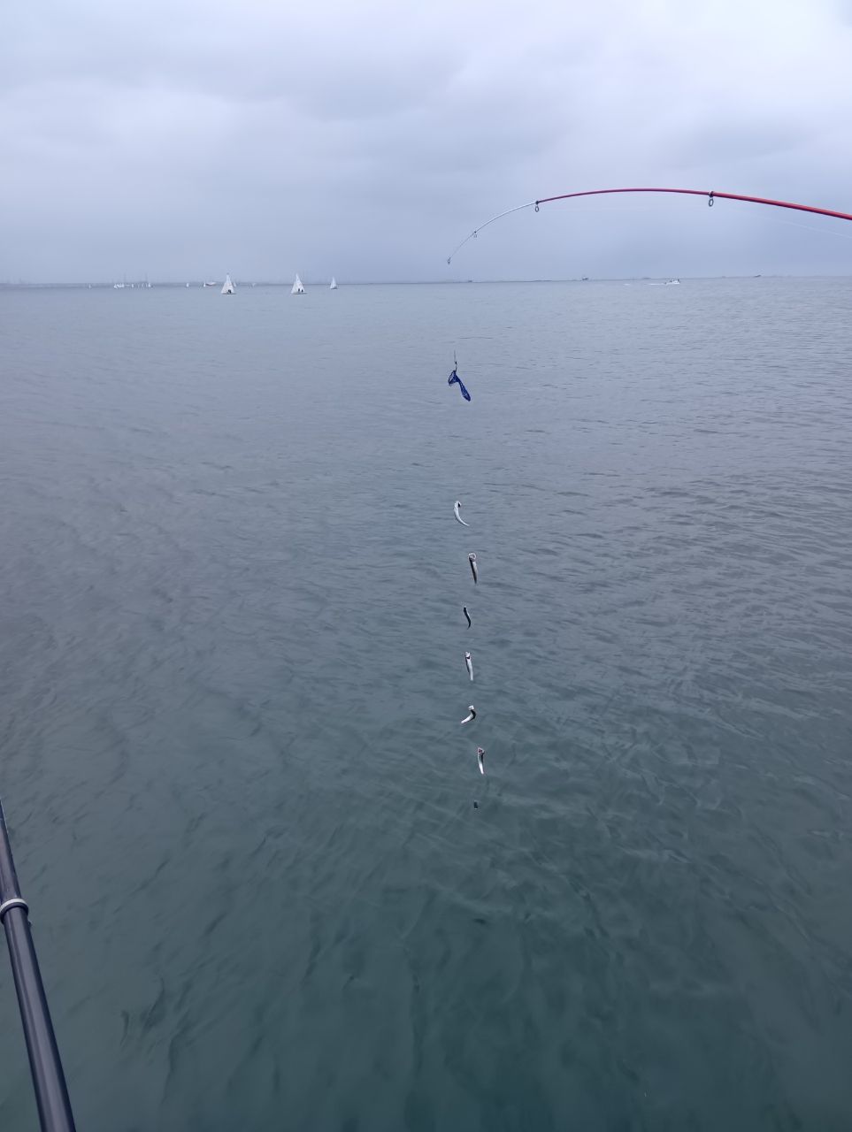 曇りたまに小雨の中、中央付近外側にて15時から18時。ショート7連上カゴ針3号。低層〜上層までアタリあり。釣果カタクチイワシ3桁164匹。周りも連掛け多数あり。