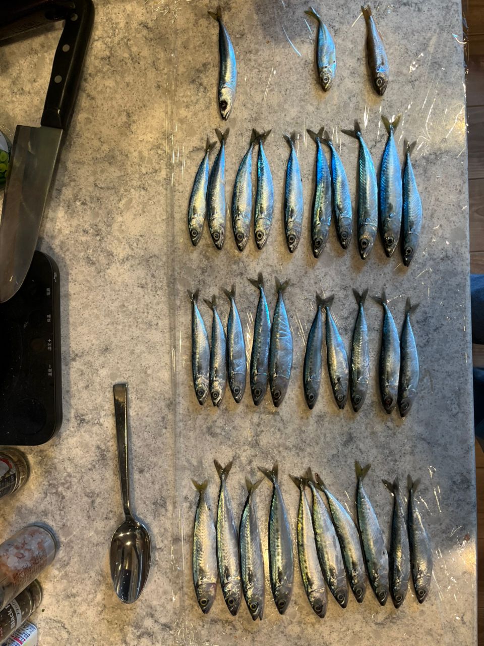 勝浦漁港にて17時から19時過ぎまでサビキ。数週間前に爆釣した時に比べサイズもひと回り大きくなってきた。