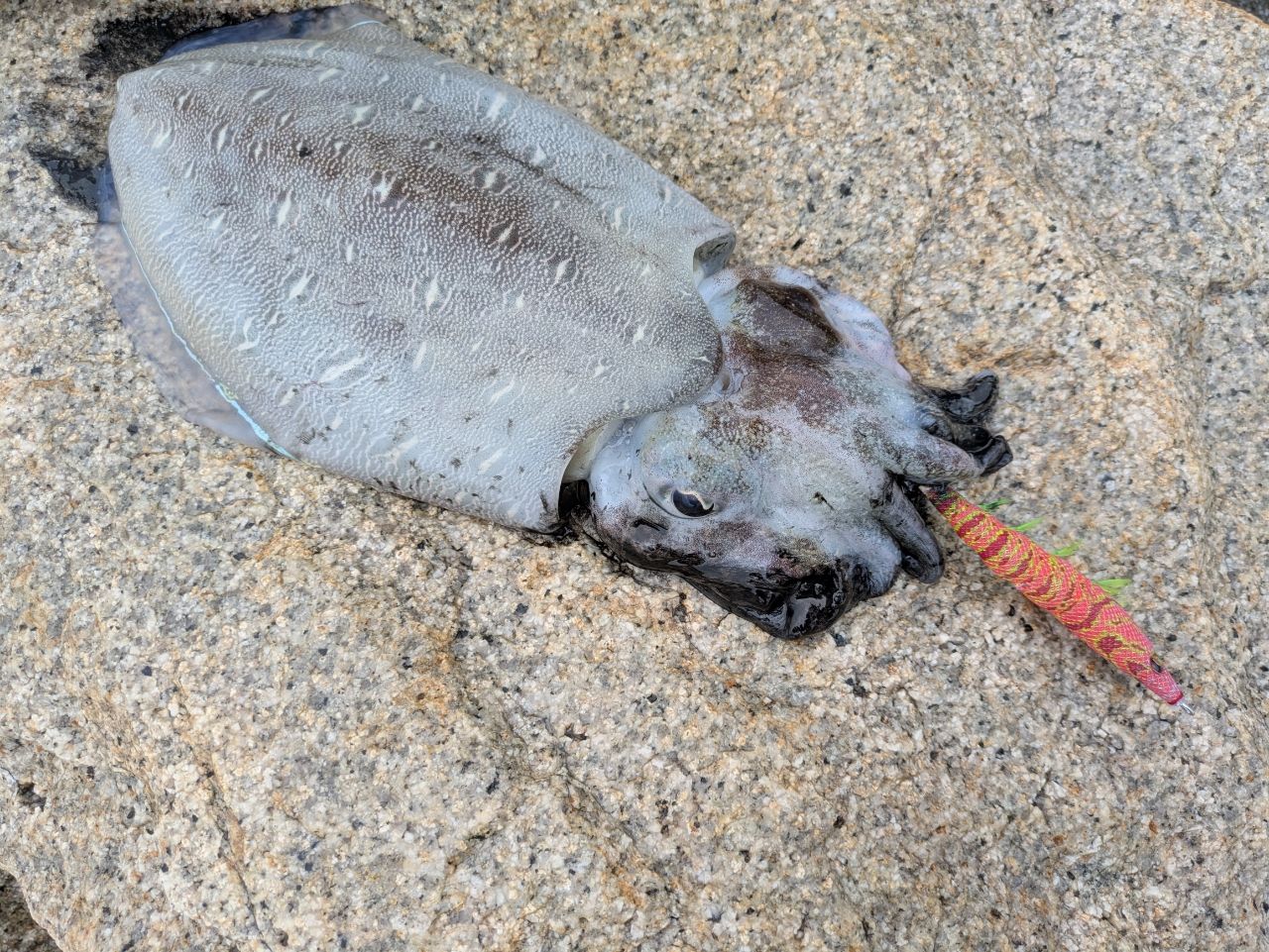 タモ入れ中にバラしてしまい、慌てて再度エギ投入! バラしたイカがまたエギに抱きついてきて無事に釣ることができました✌️