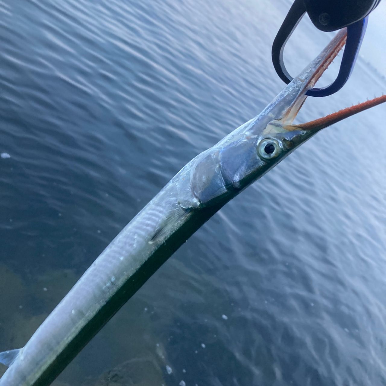 途中で表層がバチャバチャしていたので表層攻めたが、釣れたのはダツ!