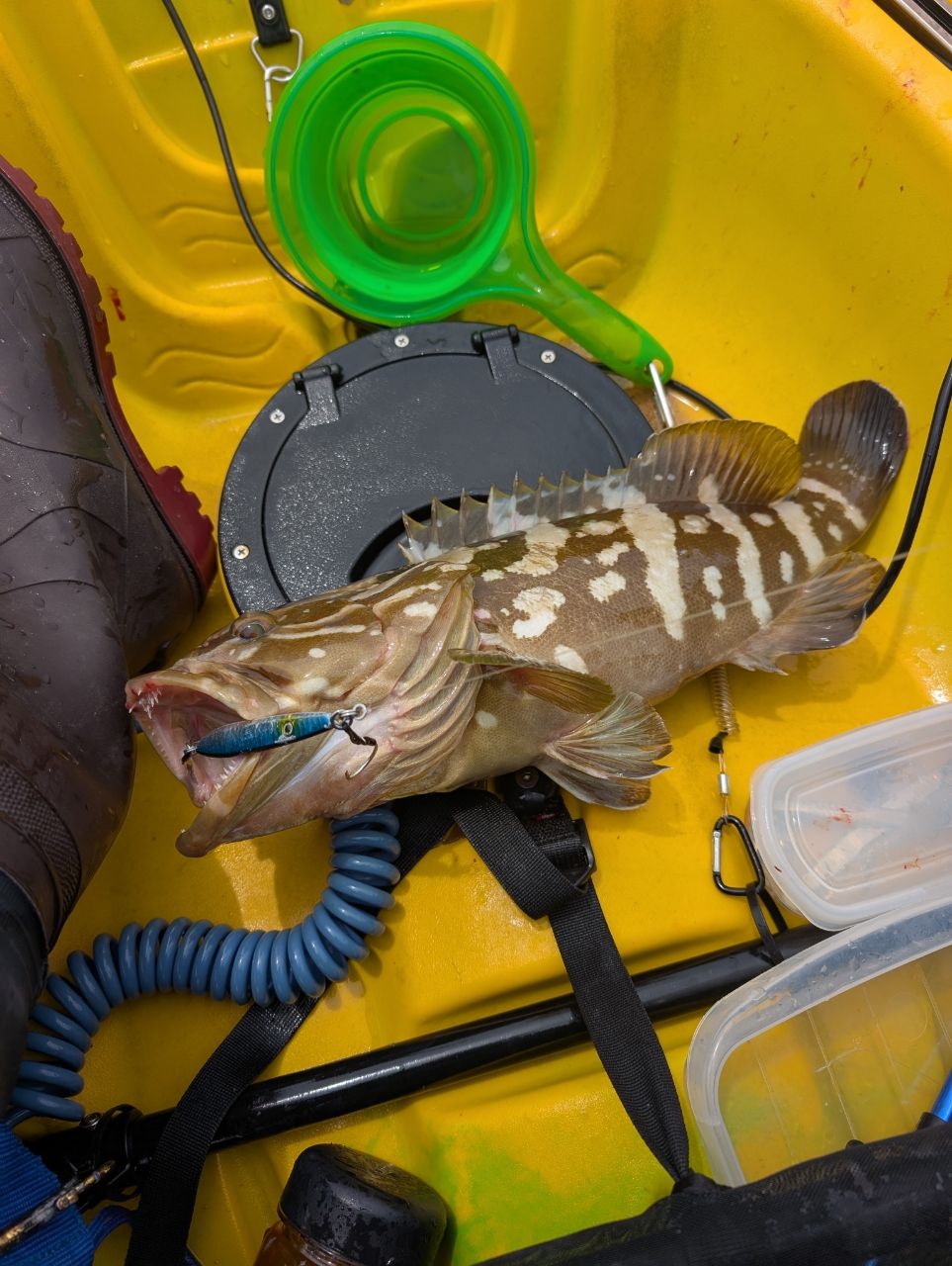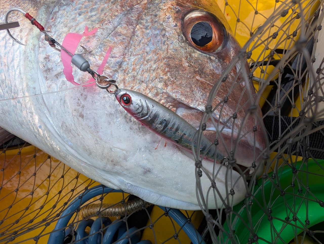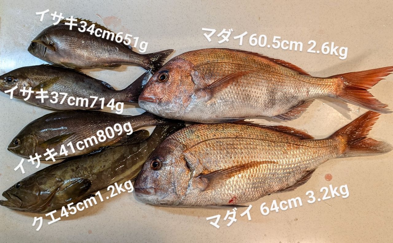 ベイトが春らしくまあまあ入っていました。この日はかなりスローなジグ操作が有効でして、キャスト後ボトムまで落とし、じっくりただ巻き10回転で再度ボトムを取る繰り返しや、ハーフピッチジャークが効きました。やむを得ず根魚が掛かってしまいダメージを最小になるようリリースしながら釣りになりますが、たまに真鯛やクエが混じるという流れになります。イサキは相変わらずかわいい顔に似合わず獰猛。変な言い方ですが汚くジャカジャカ巻いた直後に5秒ステイを入れたりテンションかけずにベイルを返してフォールさせるとガンガンアタックしてきました。
