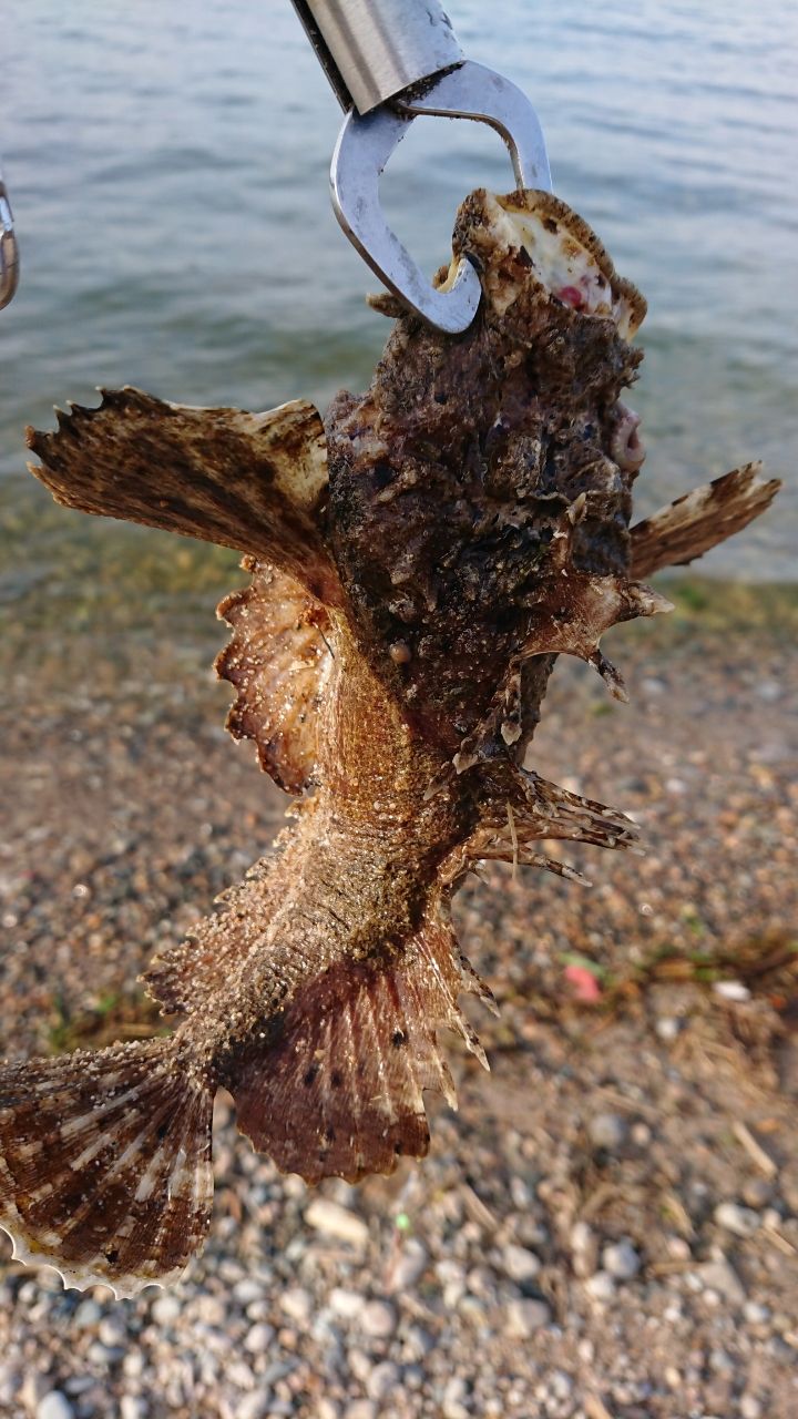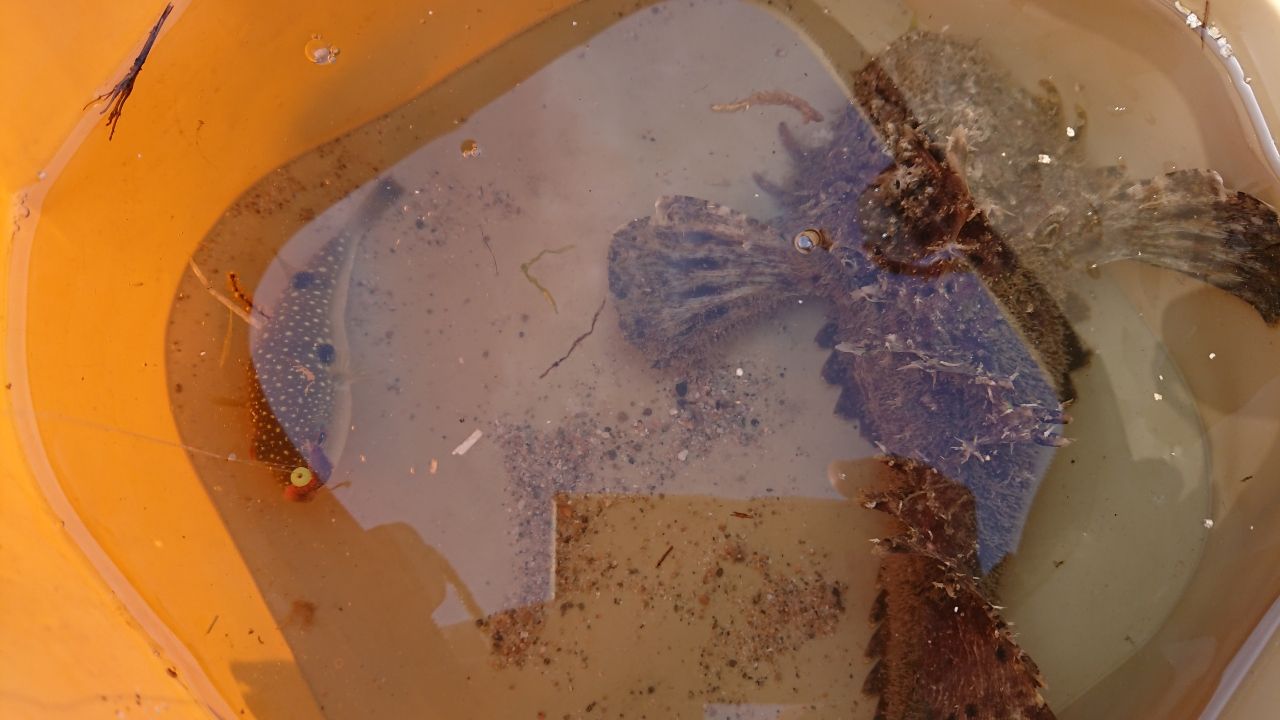 シロギスチャレンジ開始し、いきなり根掛かり⁉️かと思いきやじわじわ寄せられる❔ゴミが掛かったと思い上げてみると、まさかのオニオコゼ❗🤩