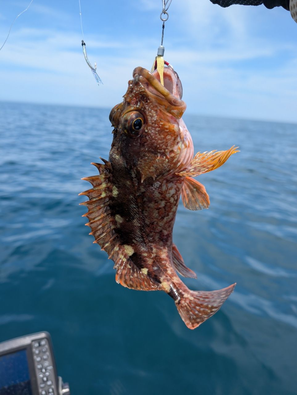 サバが釣れてるという情報を聞き、昼マズメにジグサビキでトライするも赤ちゃんサバ1枚のみで釣れるのはカサゴが10枚以上オールリリース。ベイトは多かったですが、魚探反応にもフィッシュイーターは皆無で遭遇できず。タイ狙いでボトムからスローリトリーブで再度フォールしたところ、マゴチがヒットしたところでタイムアップ。