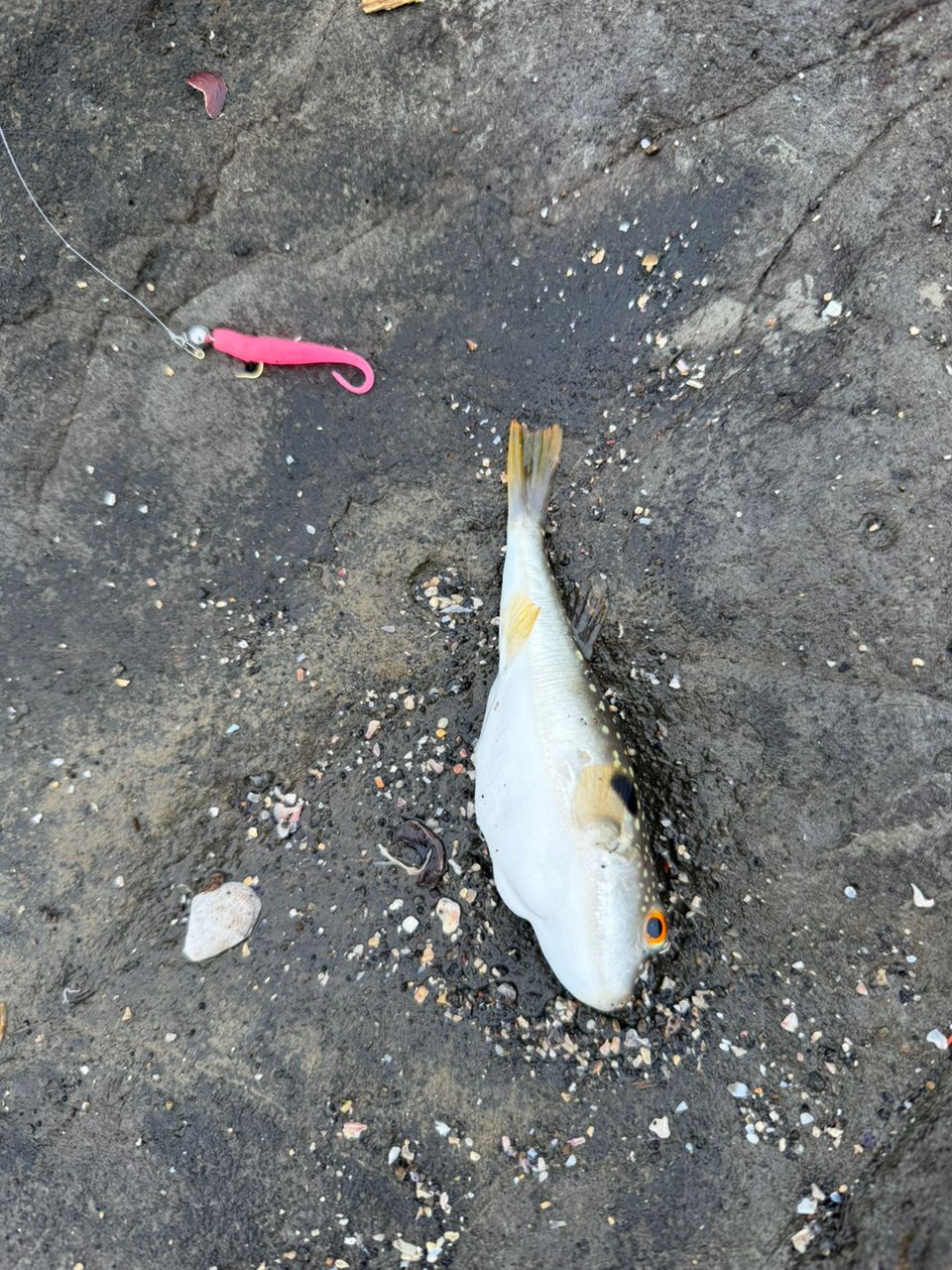 釣れずクサフグにワームを食いちぎられました...