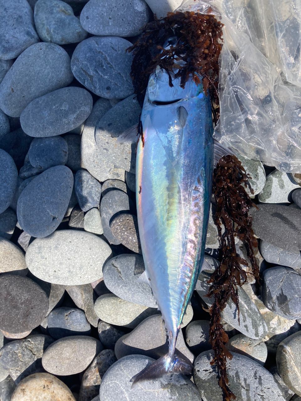 ♪海藻 丸太がなんぼのもんじゃ〜い と歌いながらジャークを繰り返すとようやくロッドが横に引ったくられます。ワカシとは違うのだよ、ワカシとは!また慎重に寄せて来るも、またですよゴミ!俺はバスのパンチングか雷魚でも釣ってるのか?切れることは無いと思ったので波に乗せてどうにか上げました(見てください、同じ魚ですが釣れた直後の写真が二枚目、海藻&ビニールの二重奏オマケ付き)。でも釣れた安堵感が半端なかったです。それに去年釣ったサバの様なソウダに比べてサイズもいい、自己記録になりました。去年は7月の半ばに初めてソウダ&シイラが同時に釣れましたが今年はソウダが先行の様です。いよいよ夏が来ましたねぇ!おっと、これは稚魚じゃないゾw