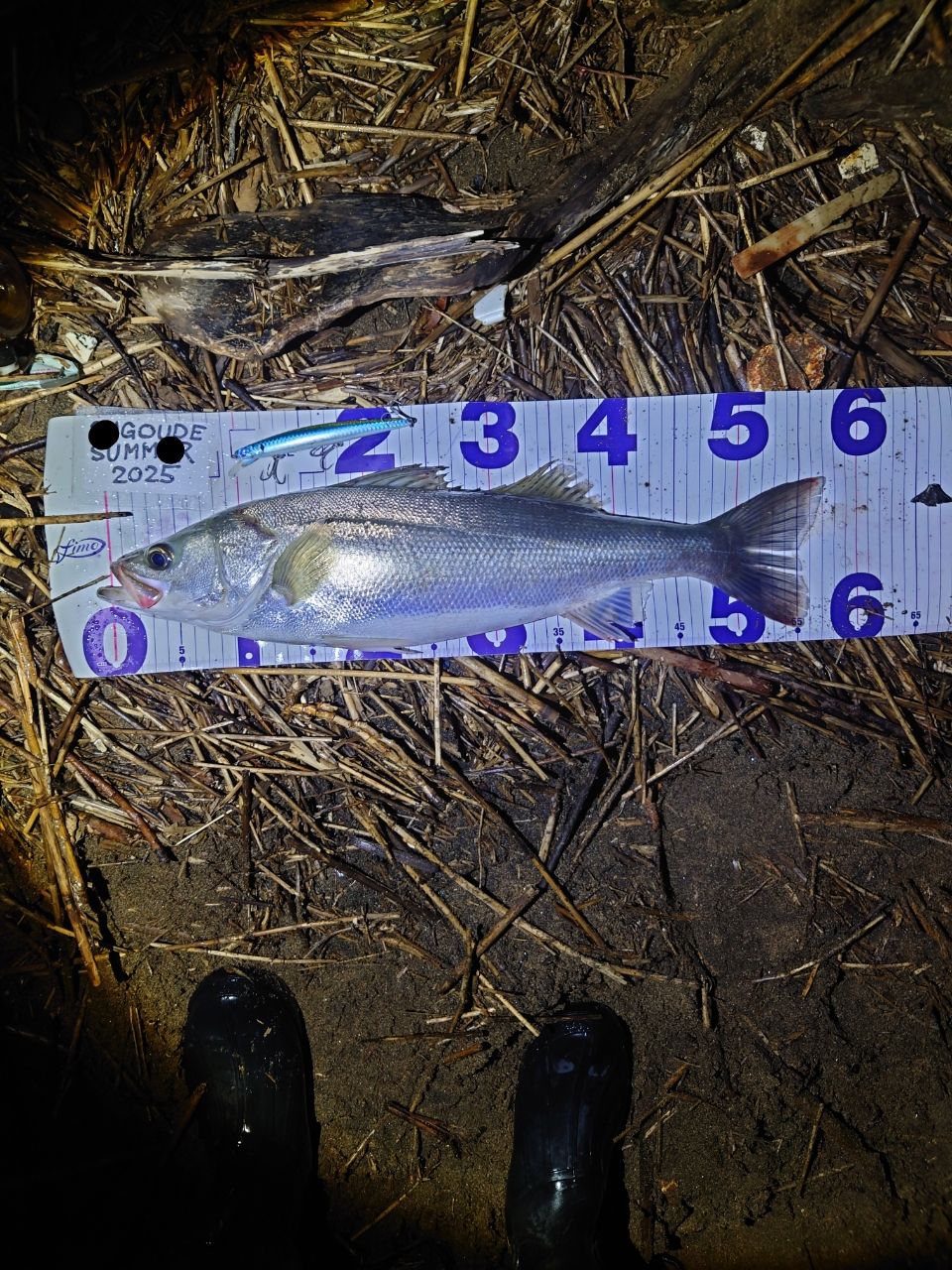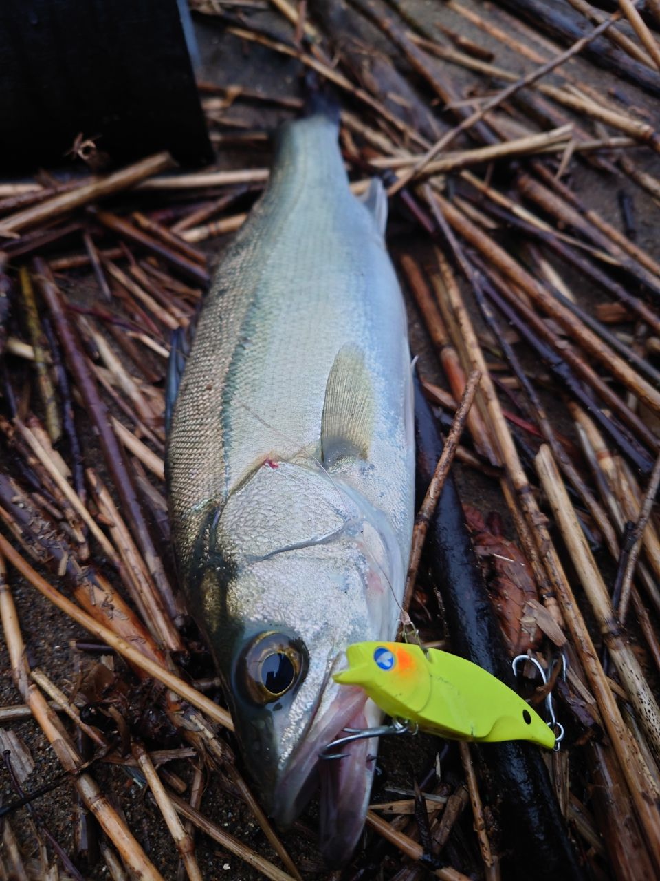 雨で活性が上がっていたのかナレージ65にシーバスがHITするが6連続バラしし、7匹目でようやく釣れたのはチーバス…
