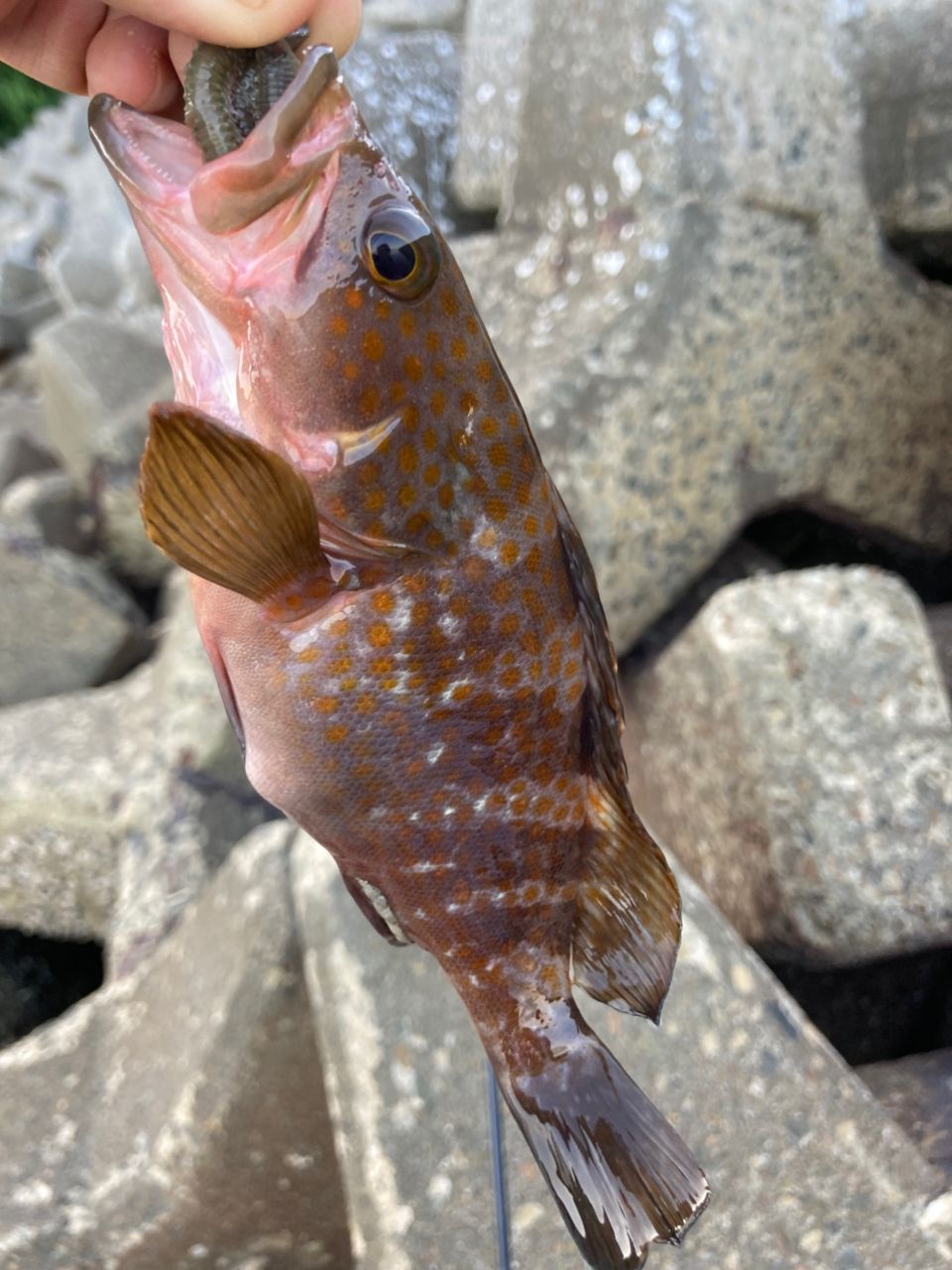 千切漁港にて穴釣り。キジハタ20センチ☺️