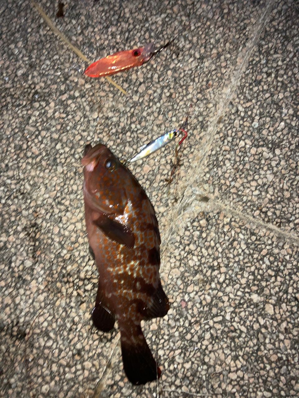 ダメ元某所が空いていてダメ元タコ狙い。いつまでも濁り海。渋々でミニタコ、ウミウシ、自作投げて引っかかりメタルジグにキジハタでした。持ち帰り釣果なし、サルベージのみ。噂によると夜だけダム放流、夜釣りイジメ。