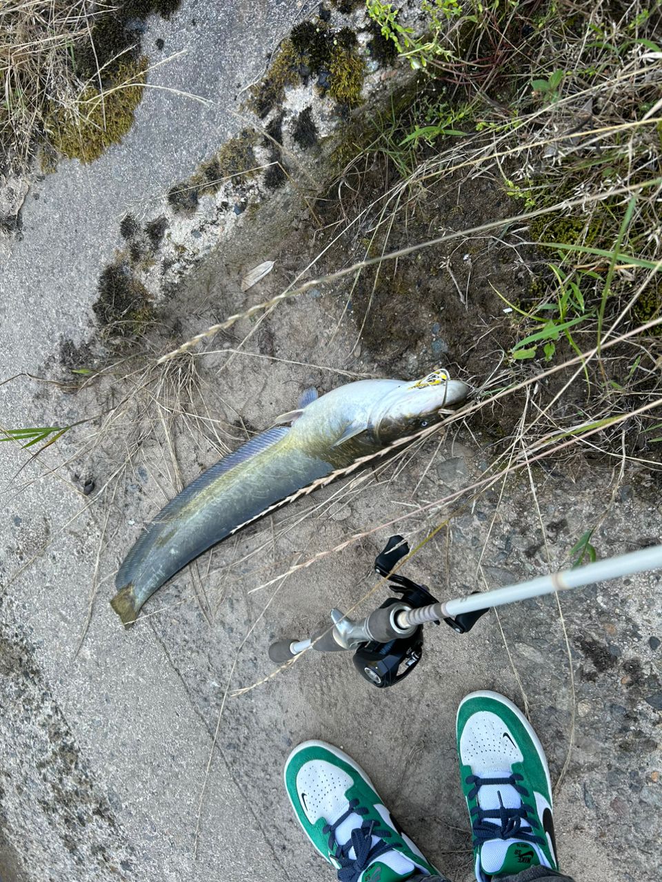 狙ってたポイントは全く無反応で、ラスト1投でロクマル超えのナマズ