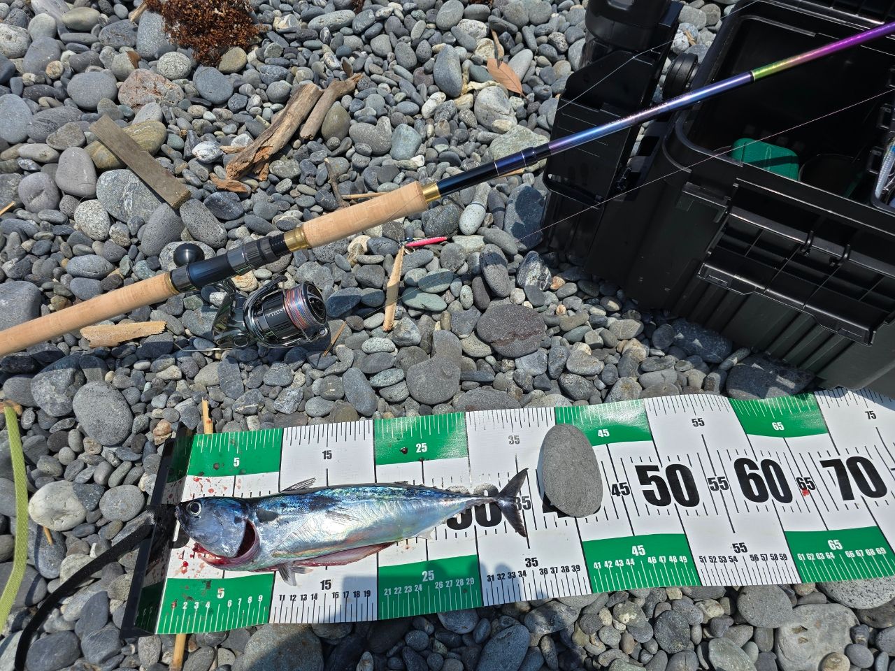 とりあえず準備をして、しばらくぼーっと座って眺めていたけども空きそうもなかったので、両隣の方々に挨拶をし、間に入らさせて頂きました。アリガトウゴザイマス🙇昨日が何やら青物パーティーだったようなのでウキウキ開始したが、反応なし。あれあれぇ、おっかしーぞぉ🤔と思いつつ繰り返し遠投をしていると遂に‼️ガンッ‼️と衝撃が来た瞬間にダーッと走るわ跳ねるわで凄く楽しい🤣ただこれはソウダ君じゃないね〜と思って上げらた立派なダツでした👏噂のソウダガツオではなかったけども、それ以上に満足してしまったのでお昼を食べようとお湯を沸かしている最中に何とマルソウダも来てくれました👏両方とも不規則ジャークでした。