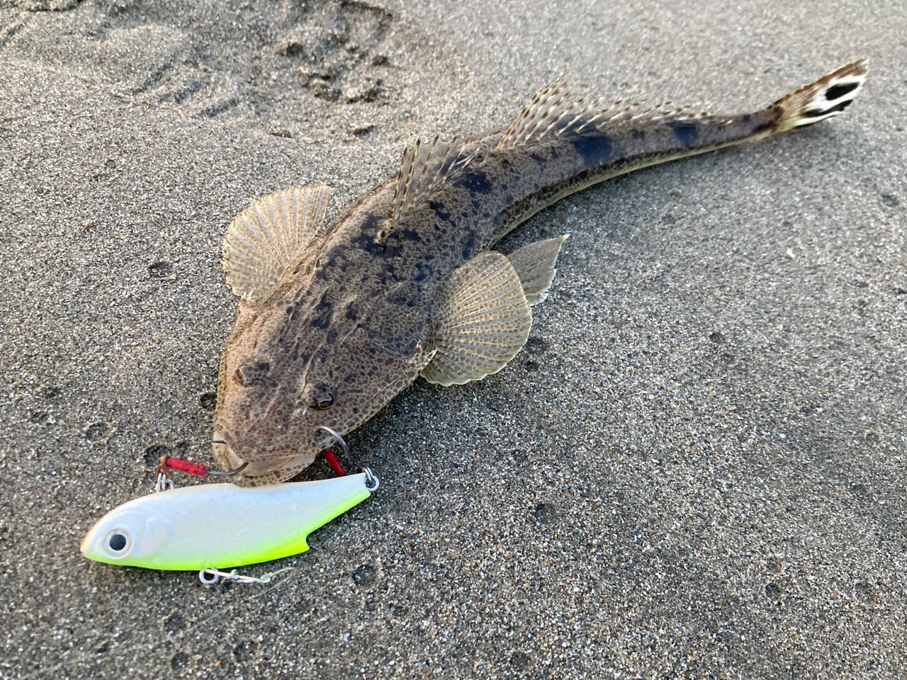 夕マズメに小さなマゴチが1匹。その後も同じようなアタリがありましたが足元でバレてしまいました…😂