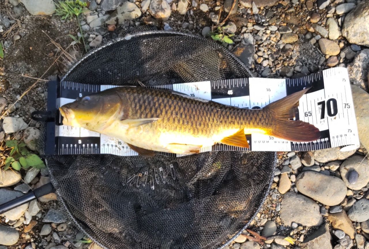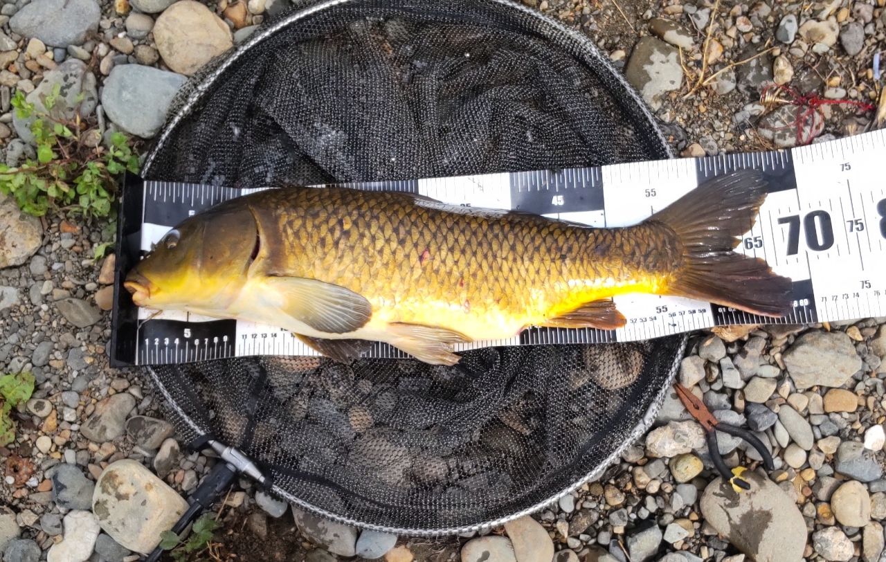 2本の竿も鯉ごころのダンゴで投げ続けて今日は大丈夫かなーって思ってて、コイがヒットして寄せてたらもう1本の竿もリンリン😵だー、やっぱり🤯粘りを見せてなかなかランディングまで持ってこれずやっとこさランディングしてもう1本の竿を握るとちょっと前から静かになったなーと思っていたら魚は外れて仕掛けは根掛かりしてました😖仕掛けとオモリをロストしてラインも結構なくなってリールの糸巻き量問題が💦さらにもう1匹追加して日差しがやばいので納竿🎣