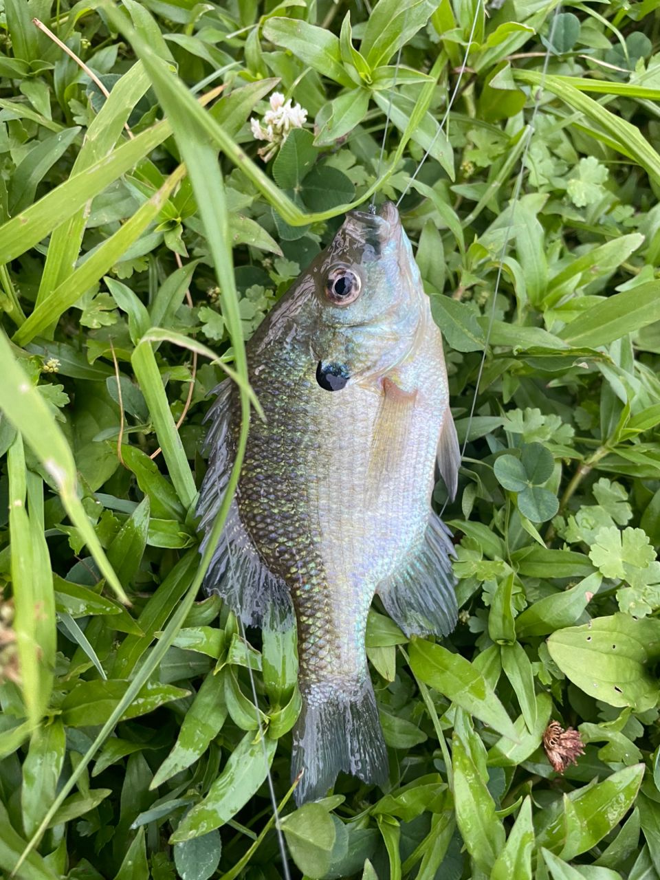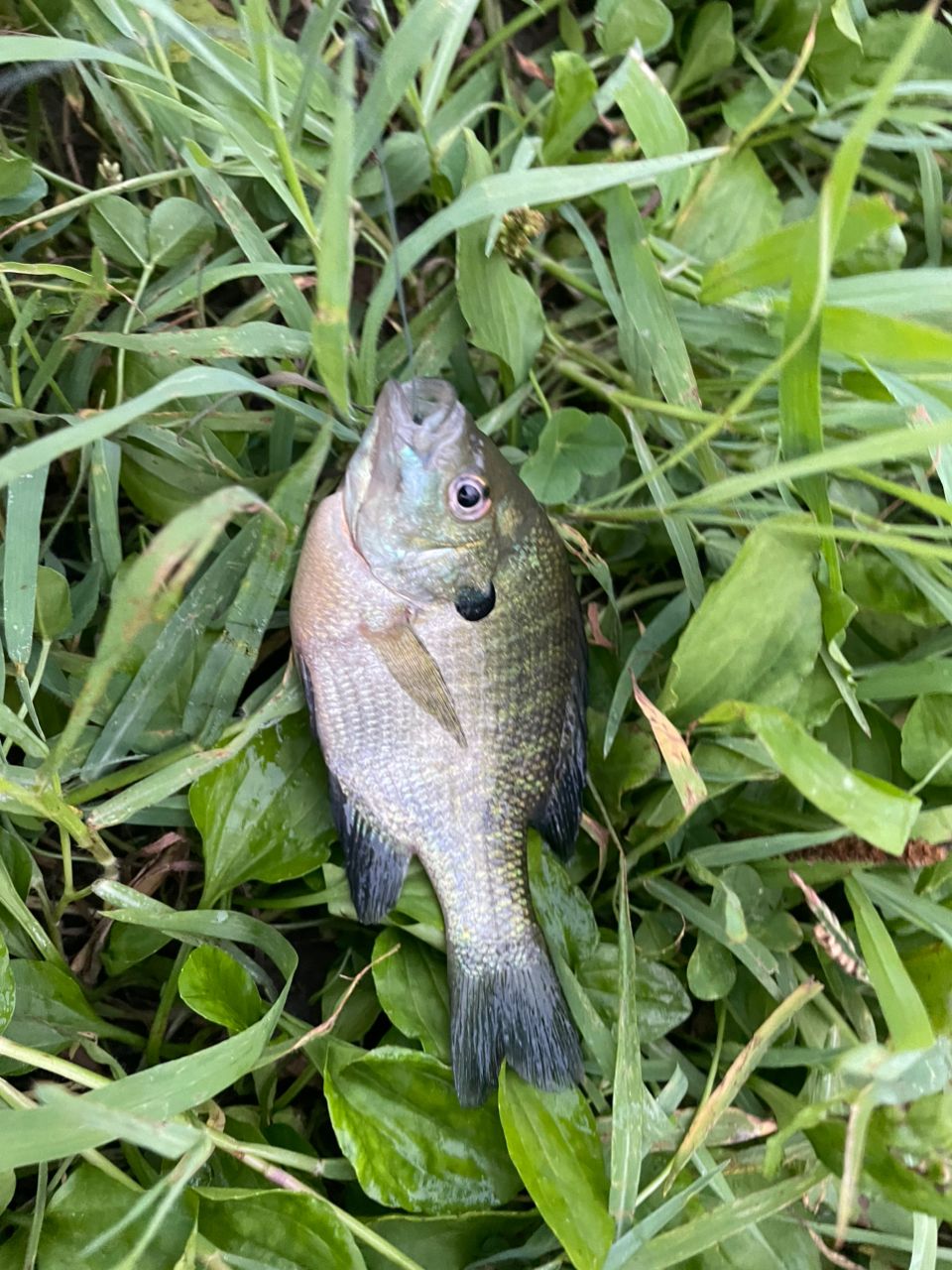 会社帰りに魚釣りをしました。暑くて水も濁っていました。色々投げたけど食いつきも無くくやしいので手前に居るブルーギルをワームちょんちょんで釣りました。